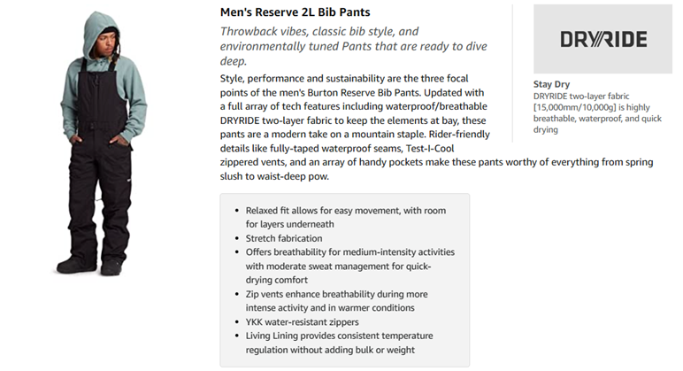 Style and performance are the focal points of the men's Burton Reserve Bib Pant. With a bib design that's as classic as it gets, updated with a full array of tech features including waterproof and breathable DRYRIDE 2-layer fabric to keep the elements at bay, this pant is a modern take on a mountain staple. Our exclusive thermo-regulating Living Lining offers the ultimate in adaptable warmth and consistent comfort. Select colorways are bluesign approved for a reduced impact on both people and the planet. The whole package is topped off with a laundry list of rider-friendly standard features, and the deal breaker: a lifetime warranty.