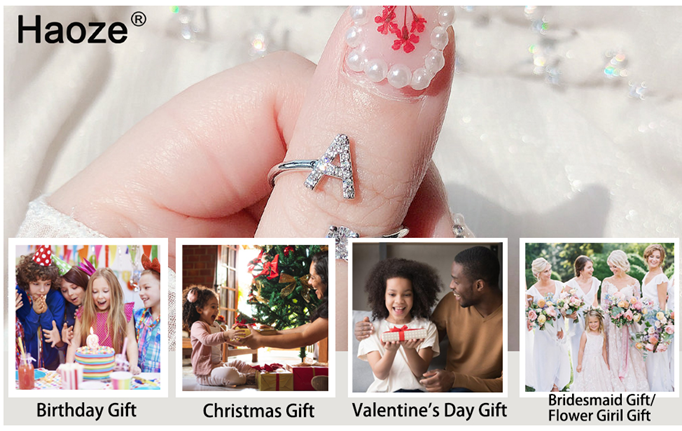 Haoze Initial Letter Ring for Women Girls Silver Stackable Alphabet Rings with Initial Adjustable Crystal Inlaid Initial Rings Bridesmaid Gift