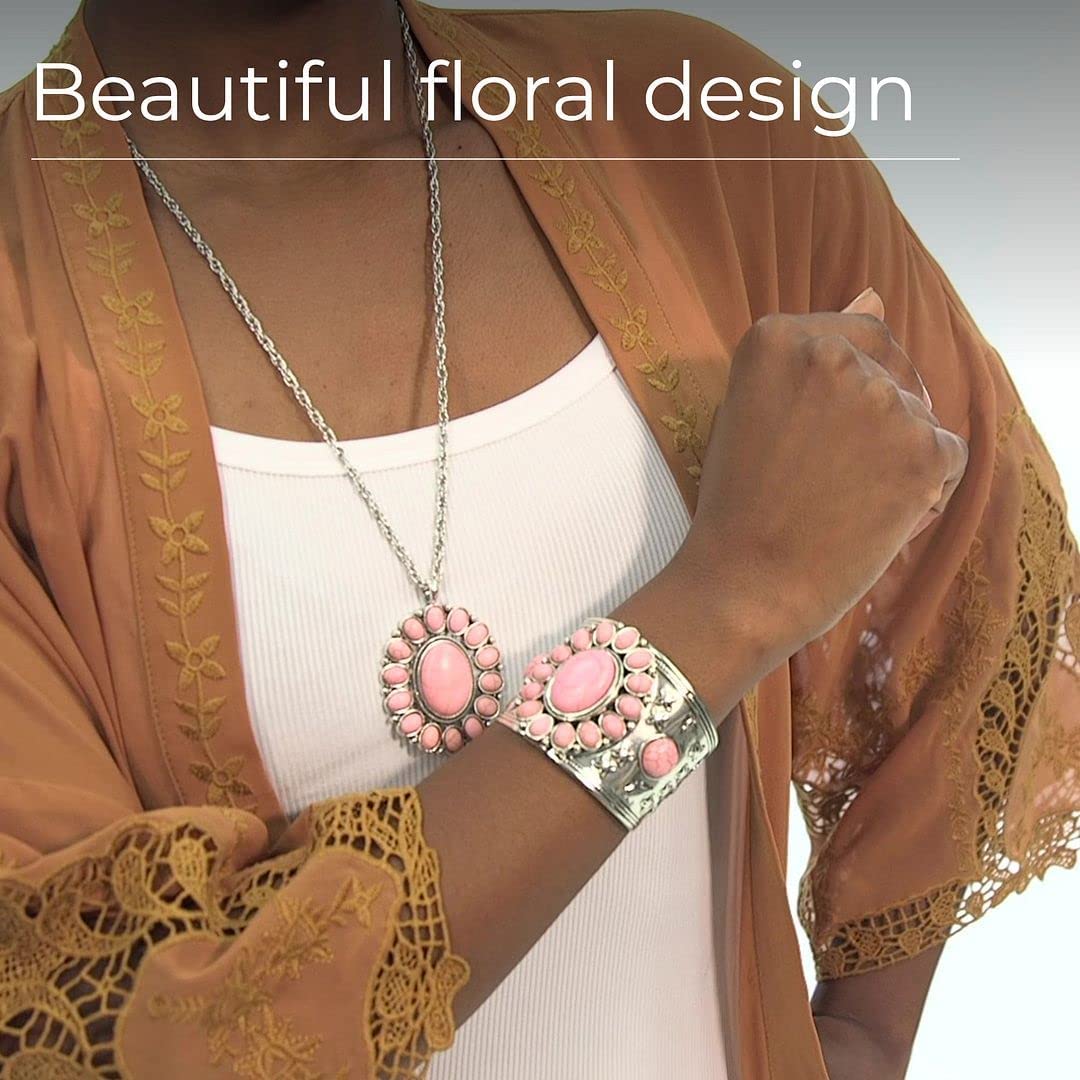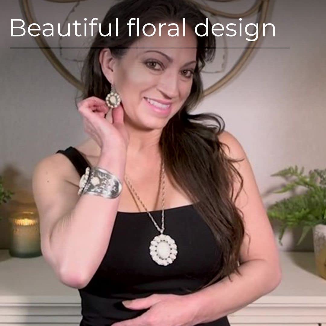 • Floral Finery - This white jewelry set features genuine natural high grade howlite gemstones set in a chrysanthemum flower design symbolizing happiness and love and enhanced by intricate handcrafted metalwork. Add a touch of southwestern style to your outfit and make a statement.