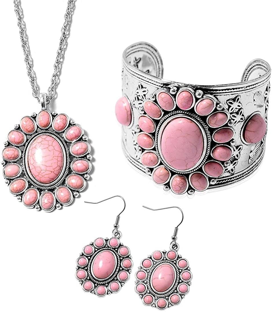 Shop LC Howlite Costume Jewelry Set - Pink, Yellow, Blue, Green & White Western Jewelry for Women - Turquoise Inspired Necklace, Earrings & Cuff Bracelet Set - Southwestern Chunky Statement Necklace