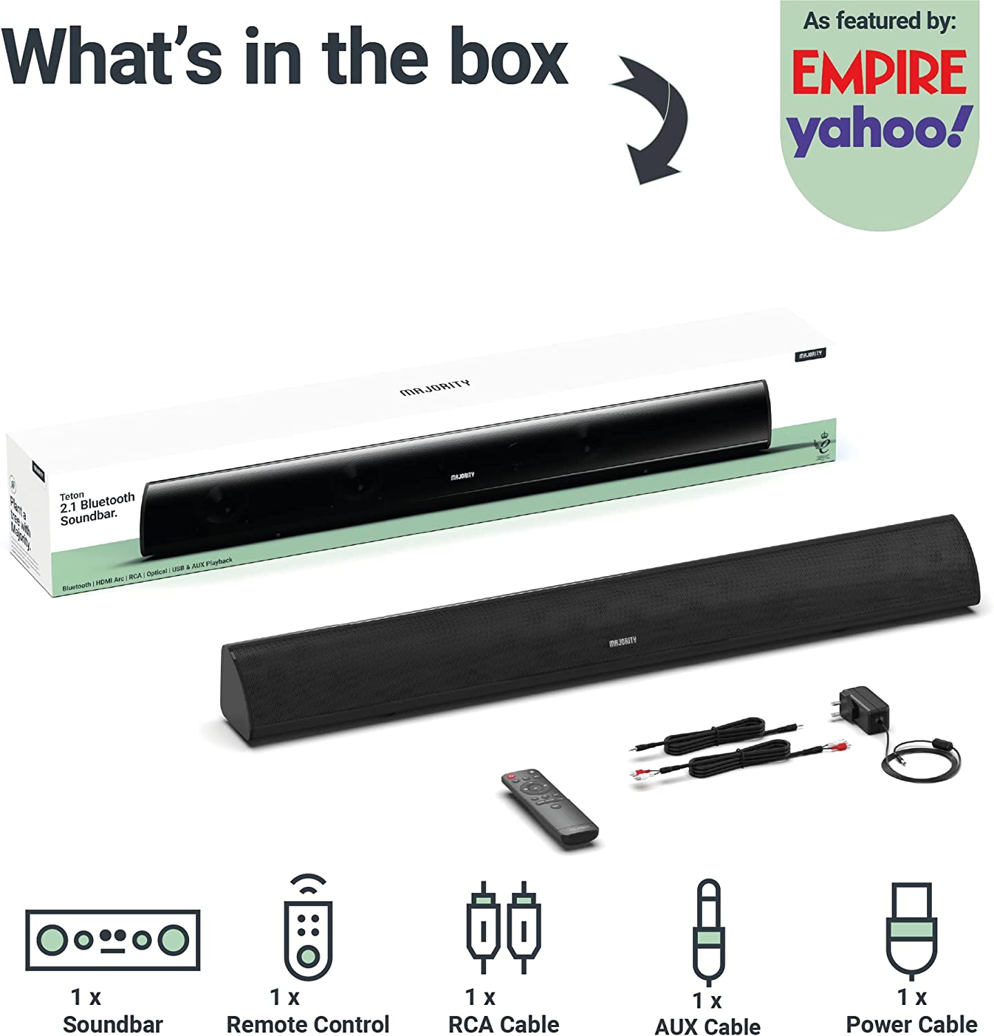 - CRYSTAL CLEAR SOUND QUALITY: The Majority Teton is a powerful TV sound bar packed with the latest audio technology and compatible with a wide range of household items such as your phone, TV, PC, laptop, projector, monitor, Blu-Ray or DVD player. Feel true cinematic surround sound in your own home and enjoy an immersive listening experience when connecting via HDMI ARC, Optical or Bluetooth.