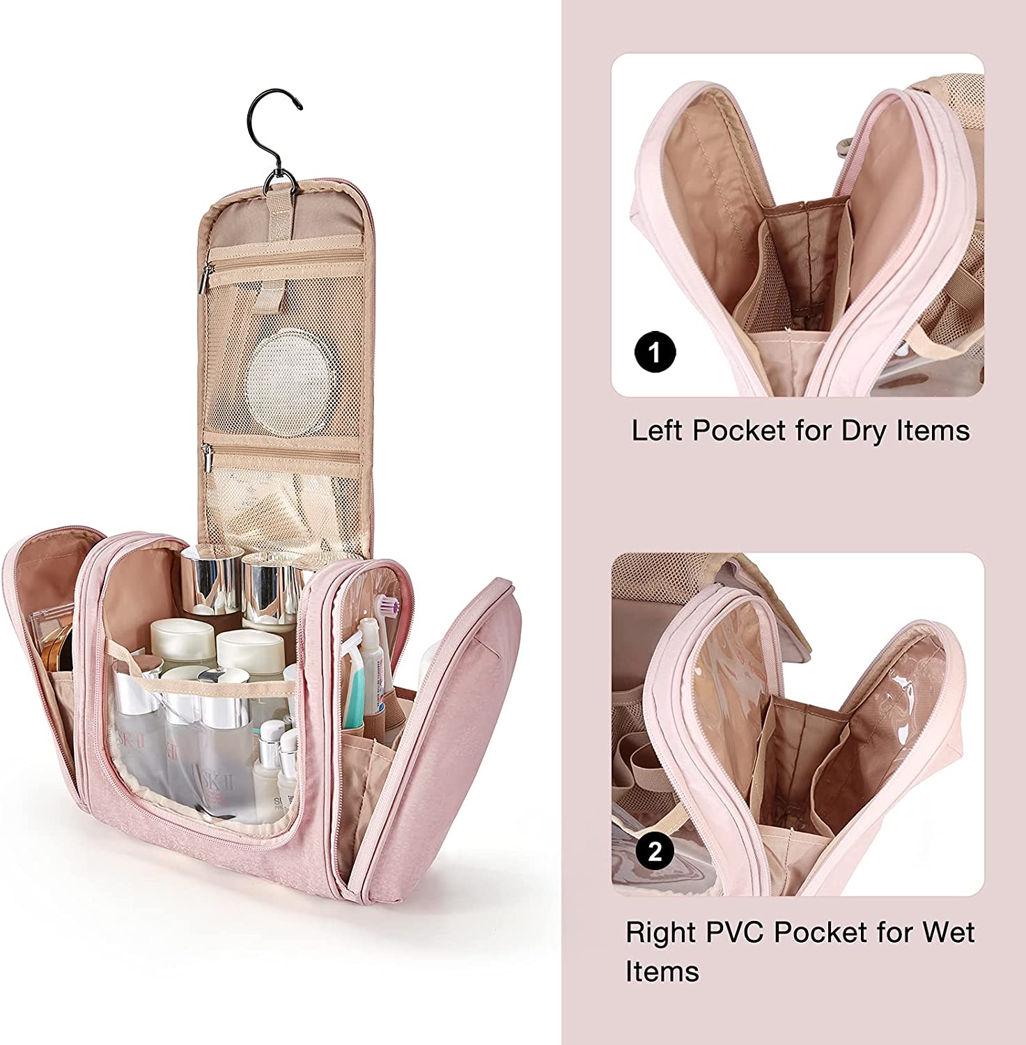 Special Design - Inner pockets with elastic straps hold bottles upright. Two side pockets of travel toiletry bag can keep the wet/dry items separated. The right side pocket with PVC material is easy to clean and dry, perfect for makeup brushes, toothbrushes, wet towels. Stow-away 360 degree swivel non-slip metal hook for versatile hanging options.Can be gifts for Women on Black Friday,Cyber Monday,Christmas day.