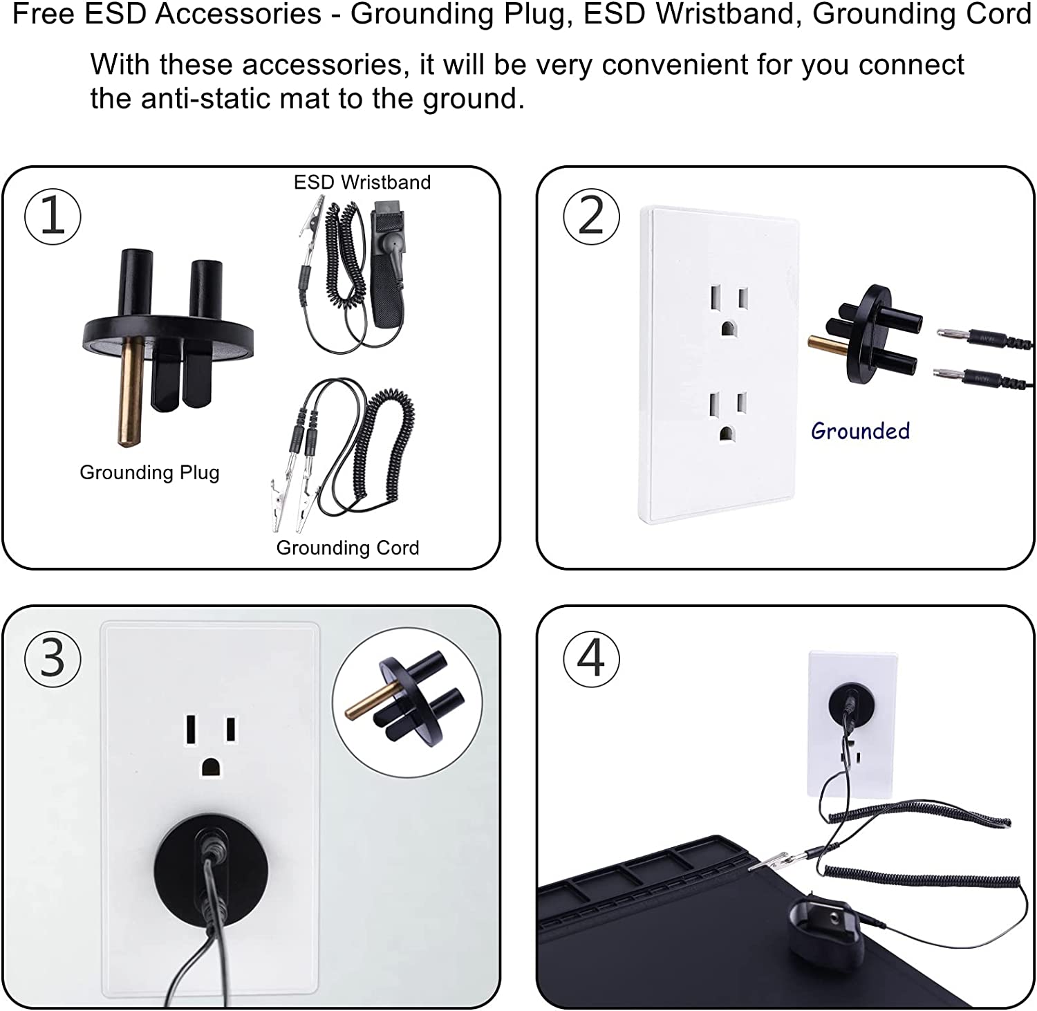 • ? 【Free Gifts ESD Accessories】- The product contains a combination of accessories kits as gift. It Includes grounding Plug, Grounding Cord, and ESD wristband. With these accessories, They will be very convenient for you connecting the anti-static mat to the ground and effectively protect your electronics devices.