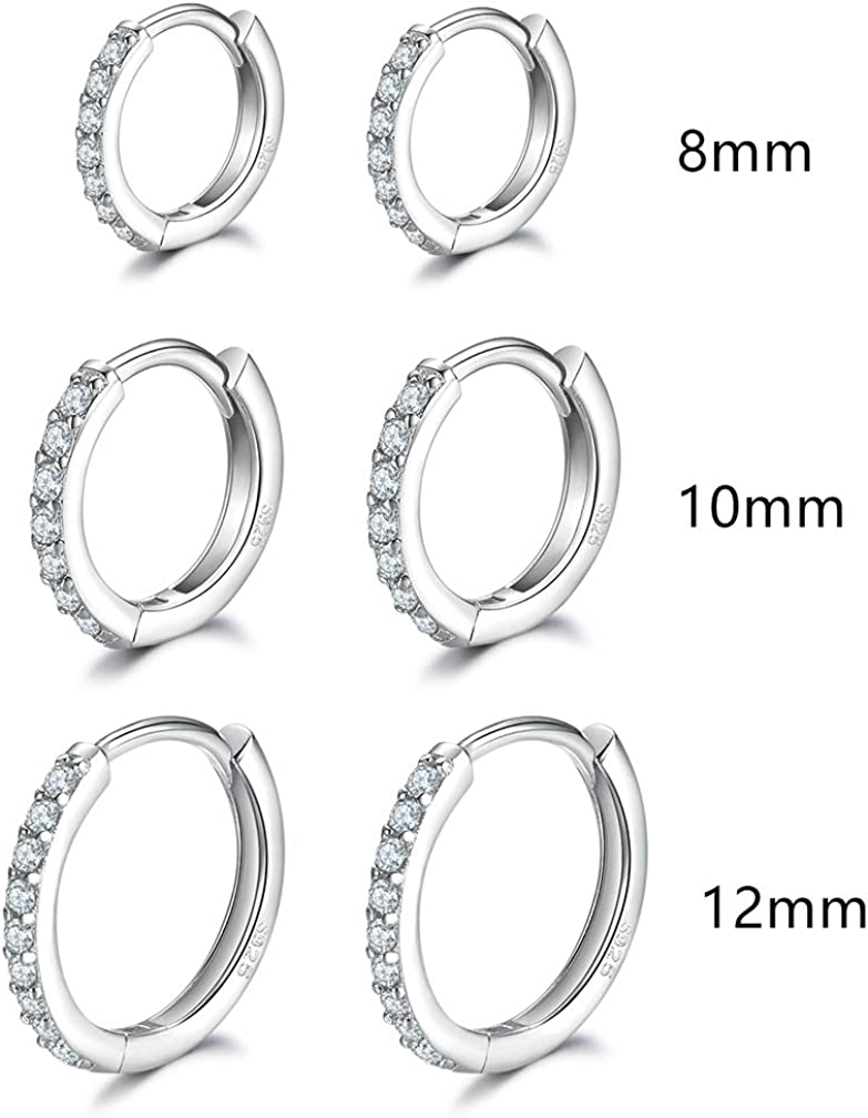 3 Pairs Sterling Silver Small Hoop Earrings Tiny Cartilage Earring Cubic Zirconia Cuff Huggie Earrings Mini Hoops Earrings Piercing for Women Girls