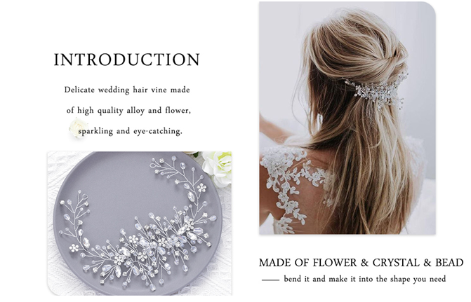 • Silver rhinestone wedding hair ornaments in unique design and excellent workmanship, made of crystal & flower & alloy wire. Party hair vine approx size: 9.84inches(25CM); 2 bobby pins and 1 ribbon for free. Silver, Gold and Rose Gold color for choose.