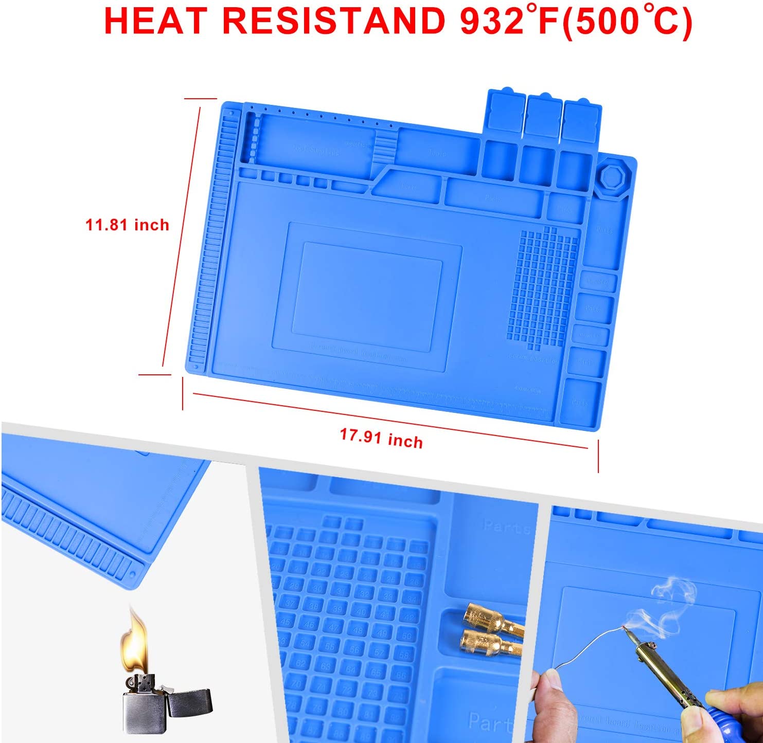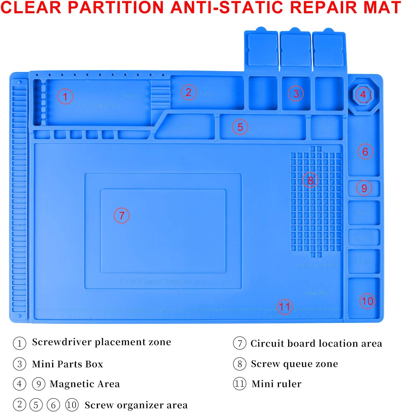 • 【Magnetic Anti Static Mat】The silicone heat-resistant mat can withstand high temperatures of 500°C(932°F), it is a necessary tool for electronics repair. This big ESD mat has a large enough working area, 17.8*11.8 Inches (45cm*30cm), and it has a clear functional zone, such as a magnetic zone, screw placement zone, parts store box, screwdriver zone, 36 cm scale ruler. You no longer have to worry about screw bits or small parts becoming messy or missing when you are doing DIY or repairing.