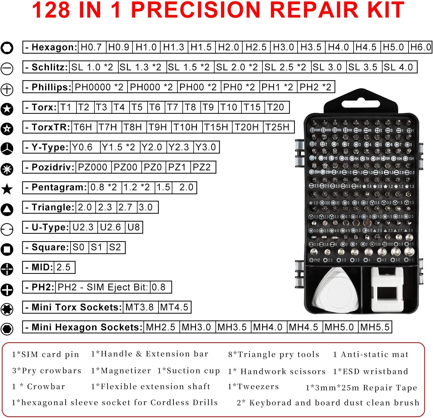 • 【Multipurpose & Good Compatibility】This precision computer repair kit has 16 types and 98 magnetic bits(Phillips, Ph2, Torx, Five-star, Straight, Pozi driver, Y-type, Torx, Triangle, Hexagon, and Square bits). From the laboratory data, it contains all screwdrivers for iPhone, Samsung galaxy cellphone, laptop, iPad, PC, Nintendo switch Wiiu and ps3 ps4, Xbox series game switch, eyeglass, jewelers, drone, PC, and other electronics which you need to repair.