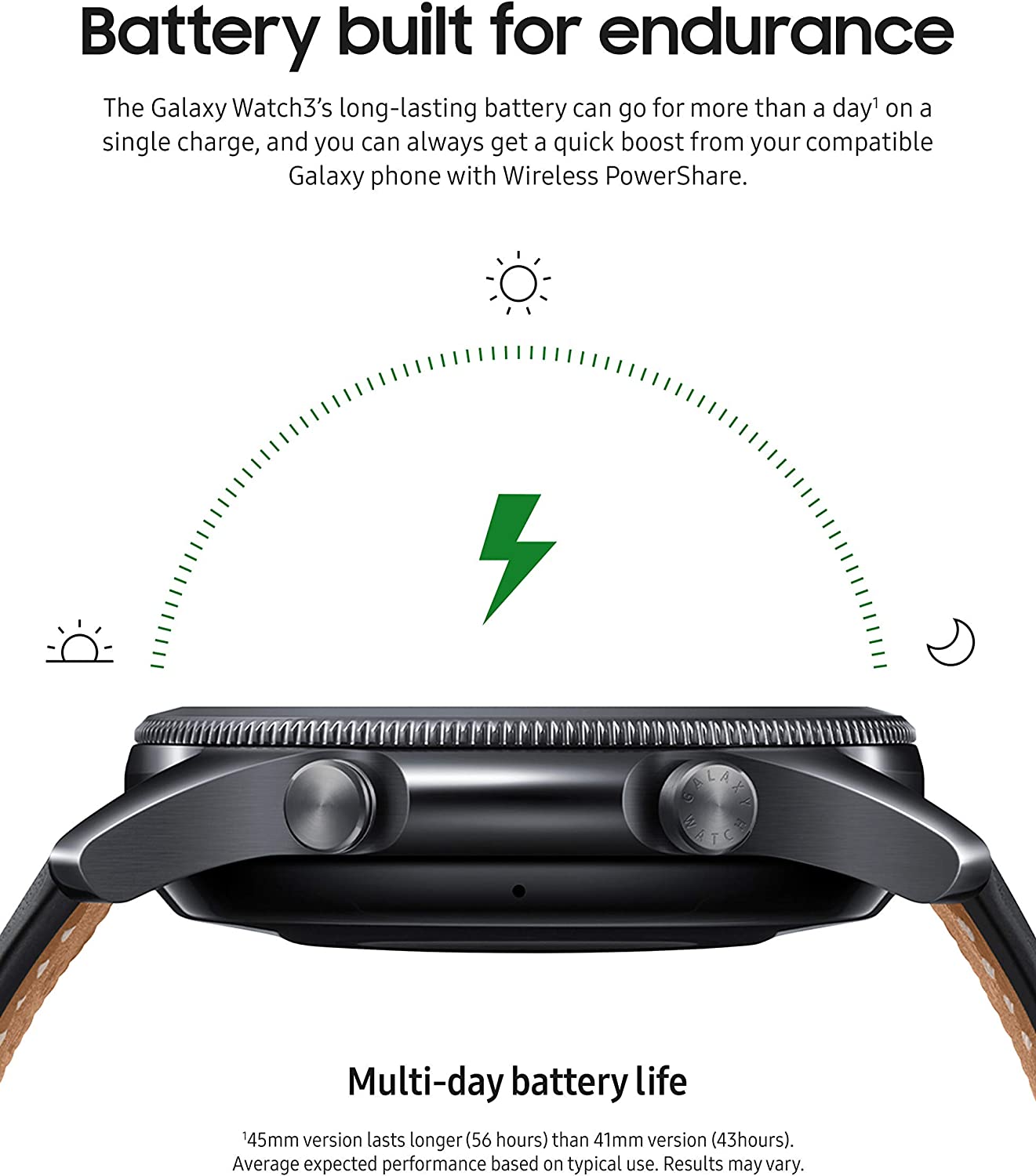 • Galaxy Watch3 combines powerful technology with a premium, customizable design so you can manage the day-today from your wrist, beautifully.