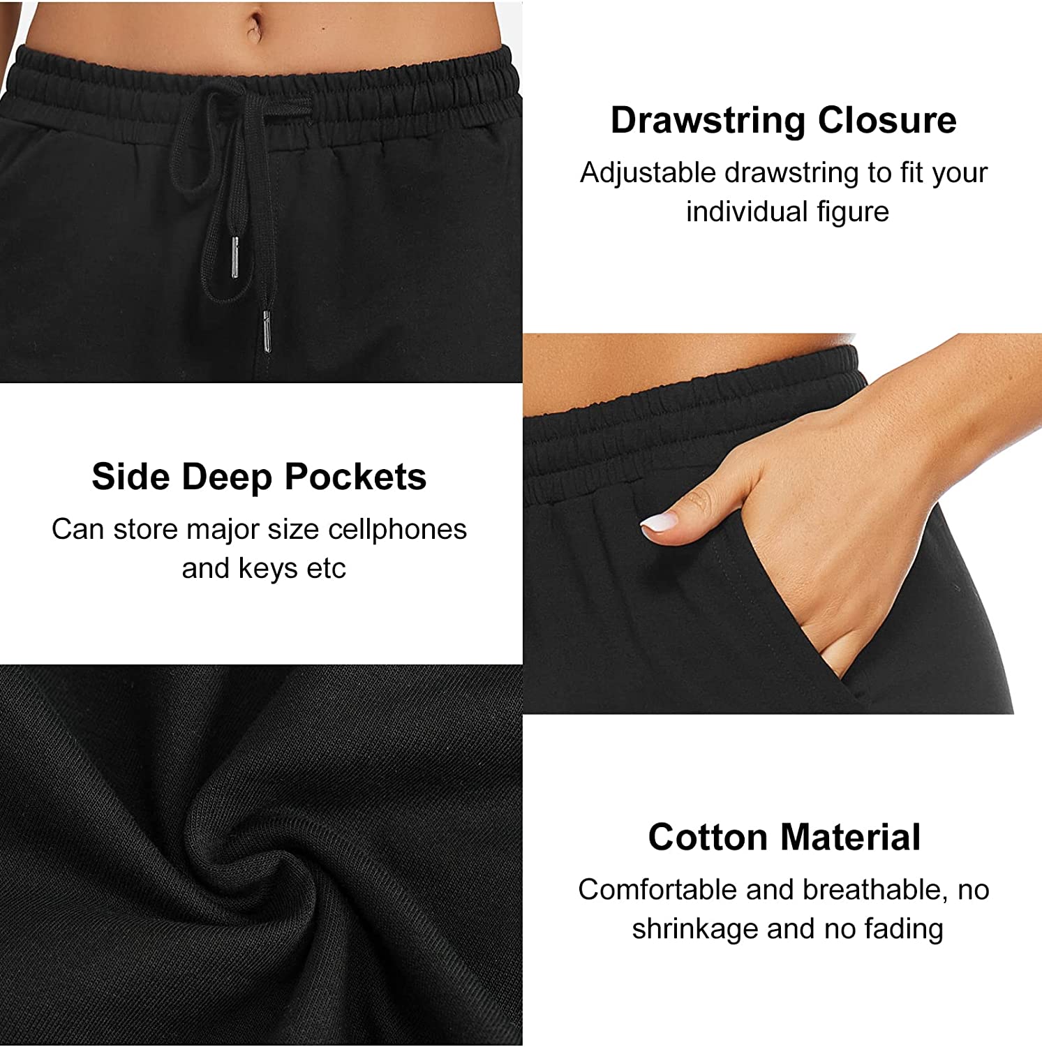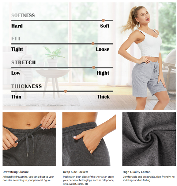 Material: This bermuda shorts made of 73% cotton, 20% polyester, 7% spandex. Cotton material give you comfy and breathable feeling. Spandex makes this sweat shorts stretchy, so you won't feel uncomfortable when you do any movement in this shortses, lounging around the house, etc.