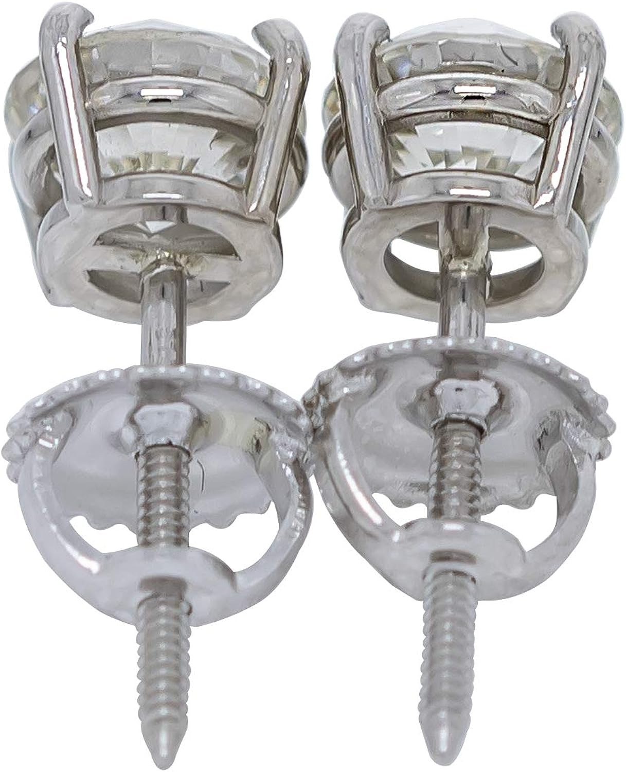 Total 2 stone diamond carat weight 1.50 cttw. minimum clarity VS2-SI1 minimum color I-J. Simple and classic, these solitaires are set in a four prong basket style 14K white gold post setting with screw back closures.
