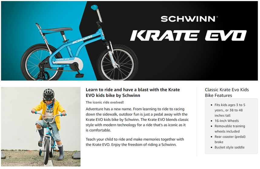 • Schwinn Krate EVO kids bike with 16-inch wheels fits kids ages 3 to 5, or 38 to 48 inches tall. Great for riding on the sidewalk or around the neighborhood.