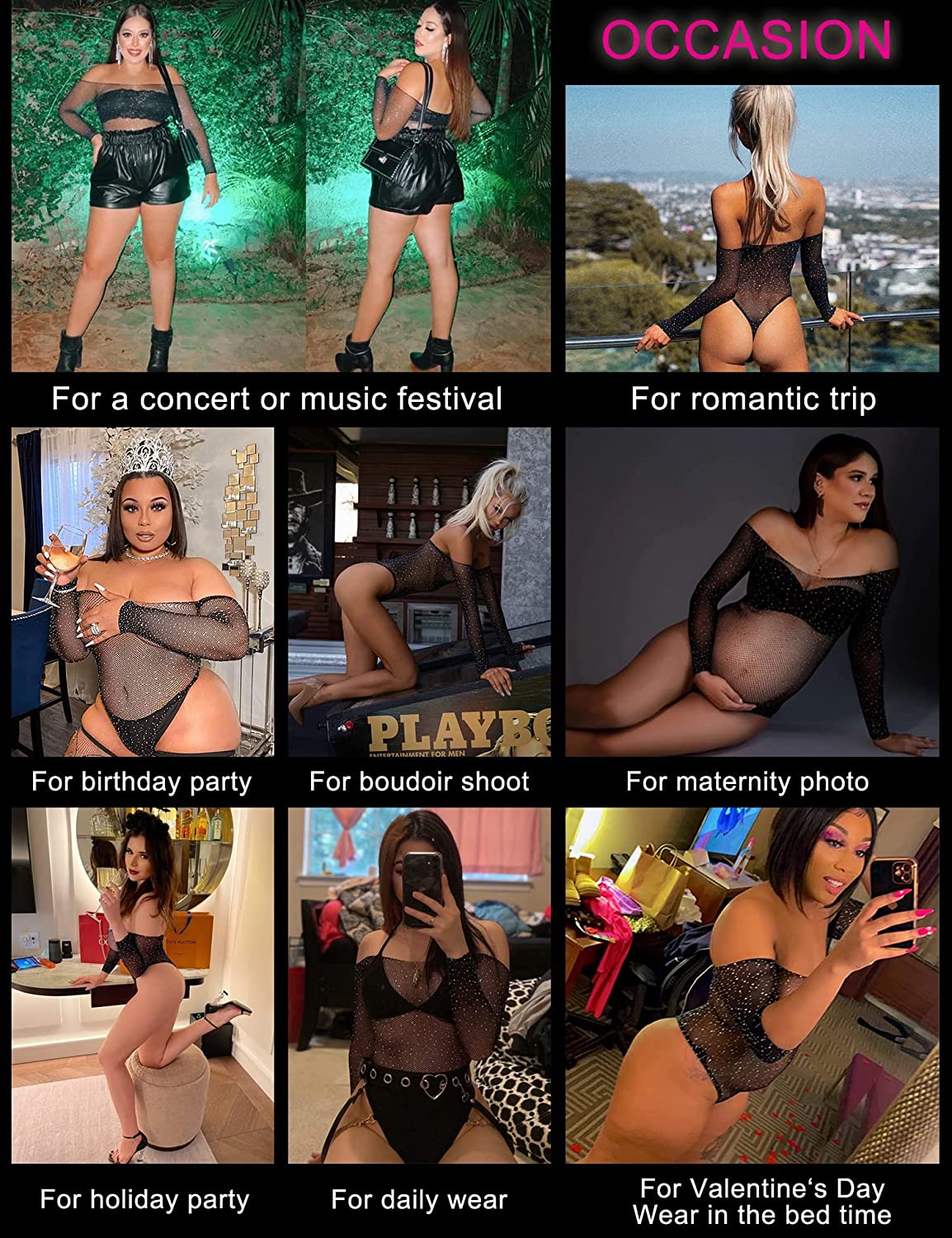 • The sparkle rhinestone fishnet bodysuit will help you show your beautiful curves, and makes you more charming.