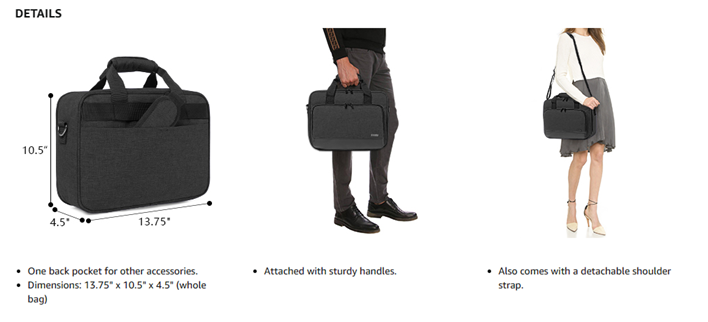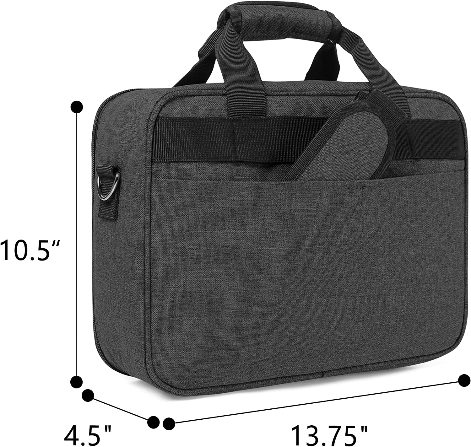 • DIMENSIONS: 13.75" x 10.5" x 4.5" (whole bag); 13.5" x 10" x 4.25" (bottom interior dimensions).
