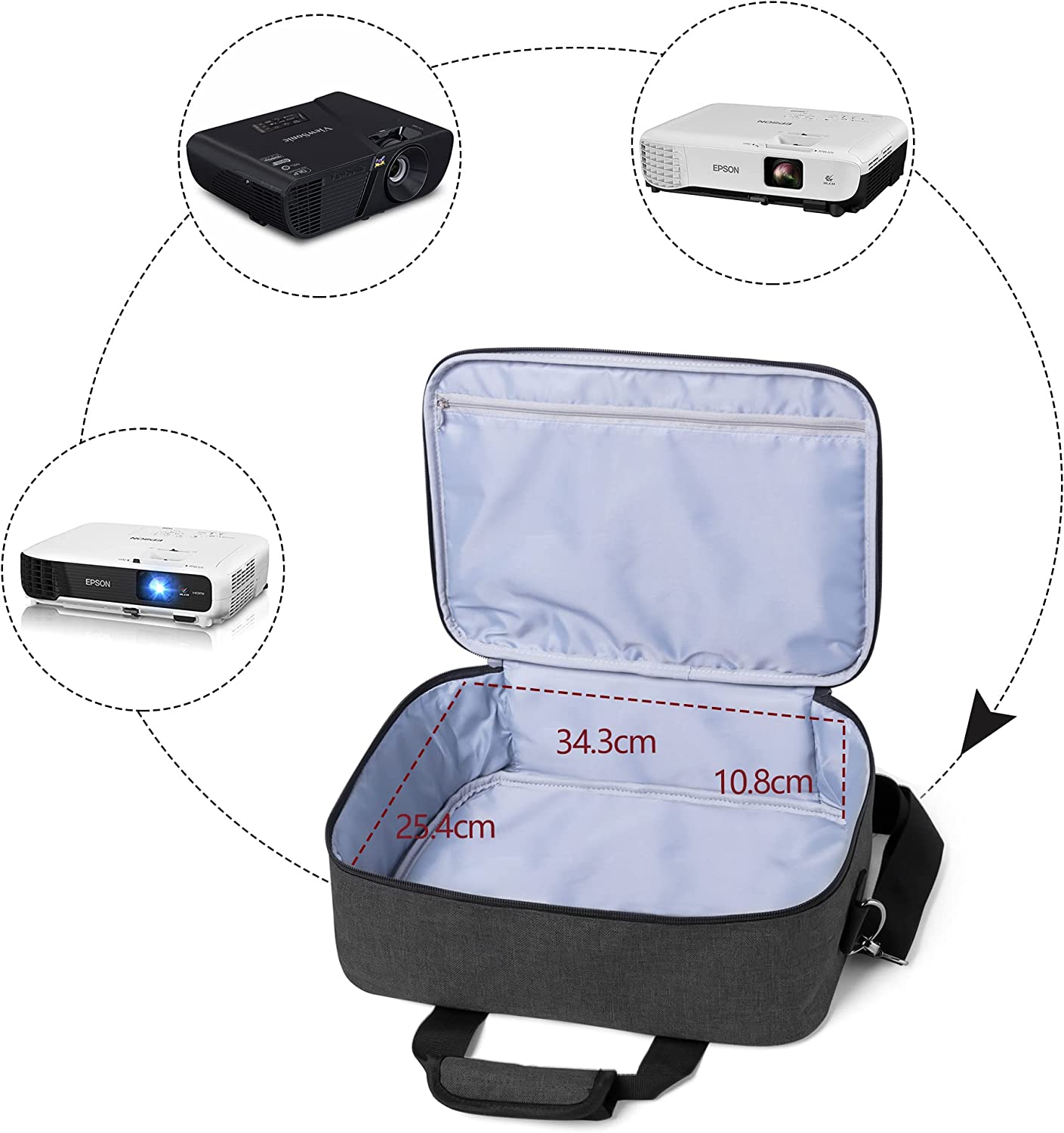 • LARGE STORAGE SECTION: The main compartment can secure the device. There is also an inner zipper pocket to put the instructions. This projector bag fits for Epson (VS240, VS250, VS350, VS355, EX3240, EX3260), BenQ (MH530FHD, MH535FHD), ViewSonic (PJD7720HD, PJD7828HDL, PJD5255). For projectors of other models and brands, please refer to the size of bottom part.