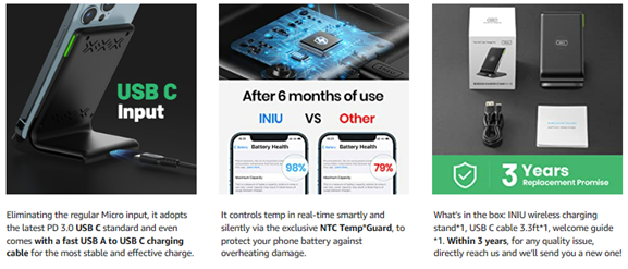 • ✅【What You Get】 INIU wireless charging station*1, USB C cable*1, welcome guide*1, 30 days money back guarantee, industry-leading 3-year warranty, plus lifetime technical support.