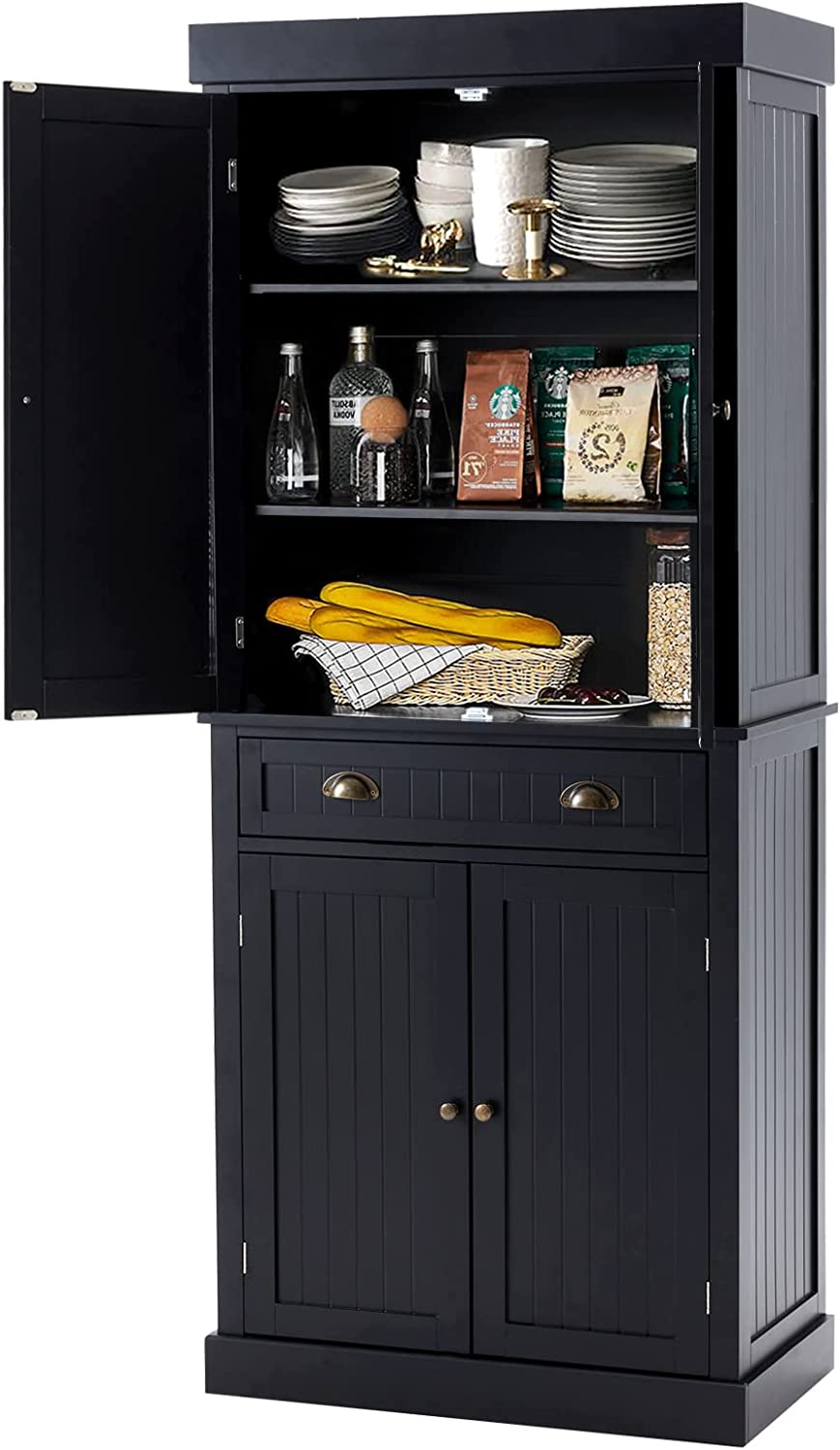 YOLENY Kitchen Pantry, 72” Freestanding Storage Cabinets with Doors and Shelves, Elegant Colonial Design Cabinet Cupboard with 3 Adjustable Shelves and 1 Storage Drawer,Black