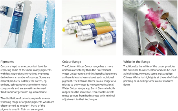 • Cotman Water Colors possess good transparency, excellent tinting strength and good working properties