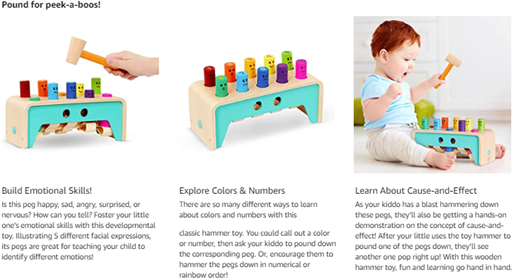 • Pounding Toy: Use the toy hammer to pound the pegs – as one goes down, another pops up!