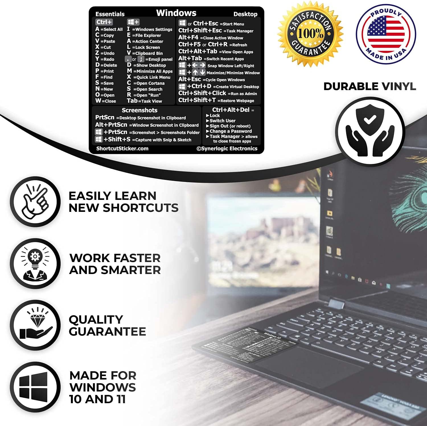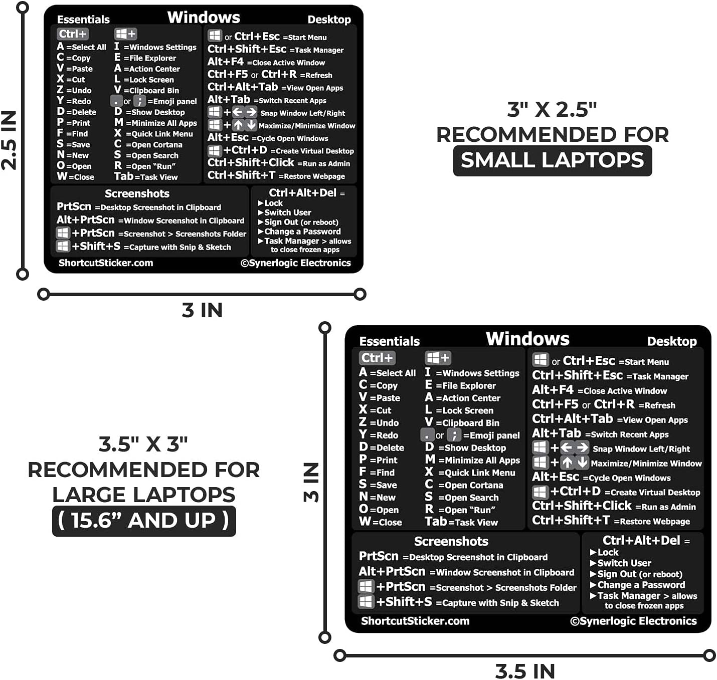 Your Windows Essential Shortcuts Sticker is an accurate, comprehensive list of keyboard shortcuts that you need. It contains a list of shortcuts for any laptop or desktop running Windows OS 10, and fits easily on the bottom corner of your laptop so you can quickly look down and read it. It is perfect for the beginner who wants to learn how to use their laptop and save time by having the key Windows shortcuts at their fingertips. Designed by SYNERLOGIC, the sticker is made of high-quality laminated chemical-proof vinyl and is more durable and convenient than a printout of the shortcuts.