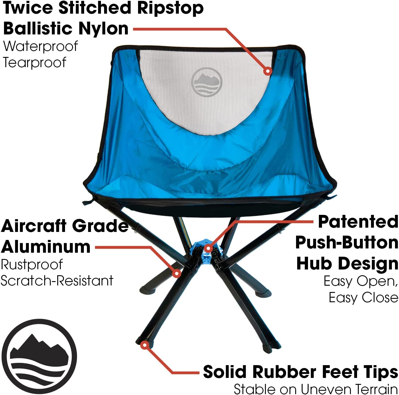 • Supportive chair: Our lawn chair has been tested extensively and supports 300 pounds, while only weighing 3.5 pounds. With aircraft-grade aluminum, ripstop ballistic nylon and double seams, our chairs will last a lifetime.