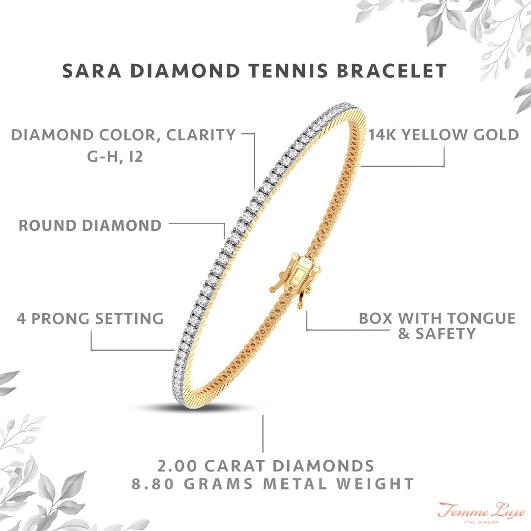 Femme Luxe Sara Diamond Tennis Bracelet for Women (2.00 Carats, G-H Color, I2 Clarity), 14K White or Yellow Gold, with Gift Box, Giftable Jewelry