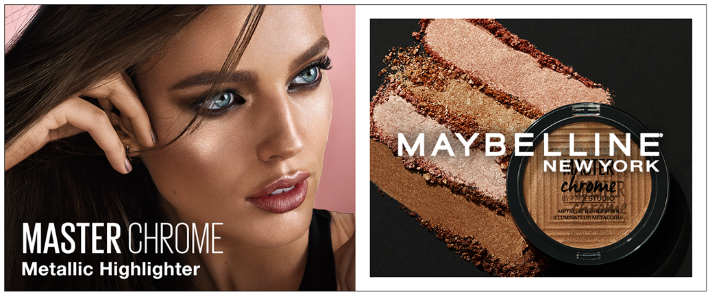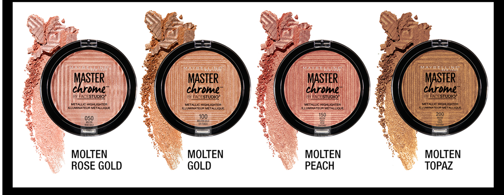 • Facestudio Master Chrome Metallic Highlighter Makeup: This highlighter powder drenches skin in a melted metallic finish; Maybelline's pearl pigments leave a reflective finish for a brilliant glowing skin