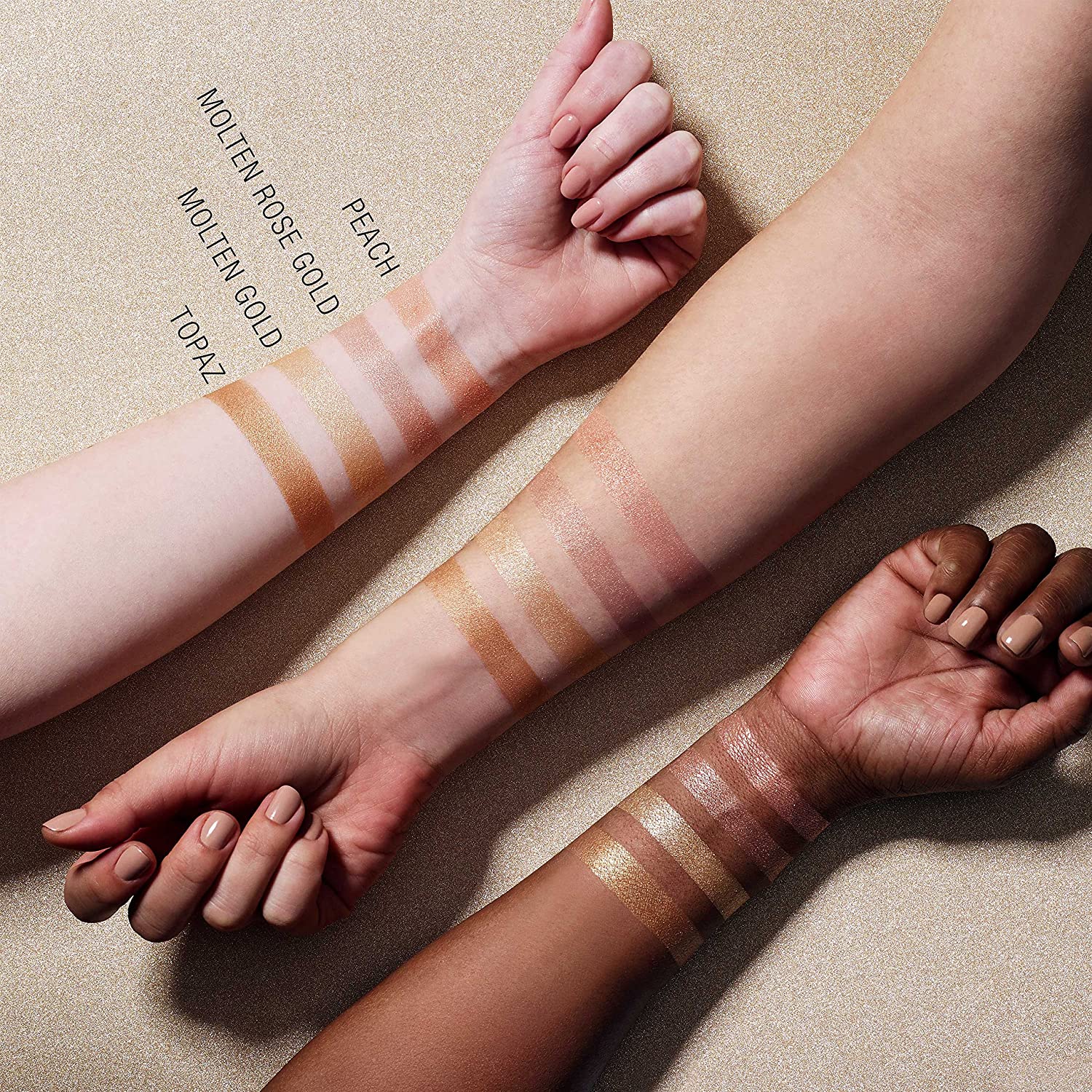 What's happening now? The chrome effect. Now, skin heats up with a warm metallic sheen. This face highlighter is infused with metallic pigments that create a reflective finish.