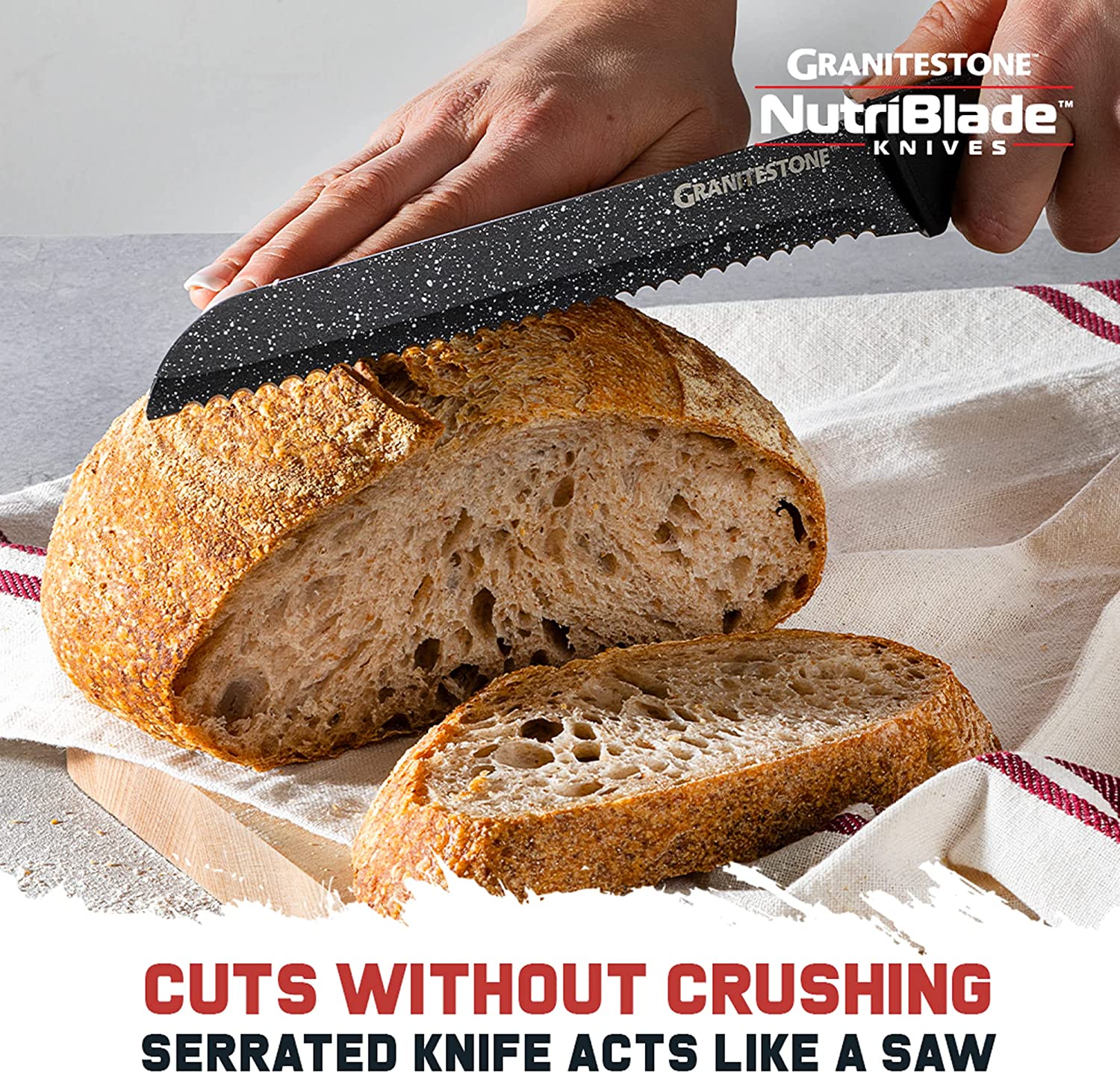 • Ultra Sharp: Tempered, stainless steel blades are ultra sharp, cutting through kitchen work faster and easier; coated with ceramic non-stick Granitestone finish to make clean up a breeze. Caution: Super sharp blades. Handle with care.