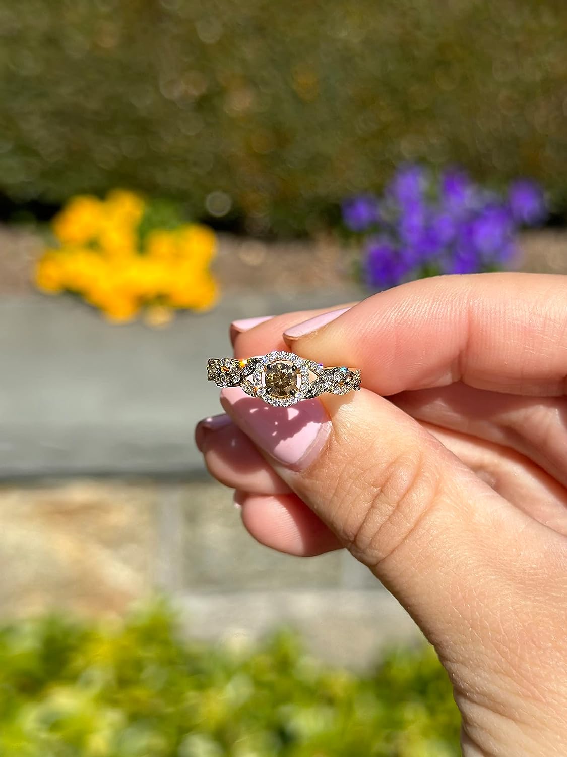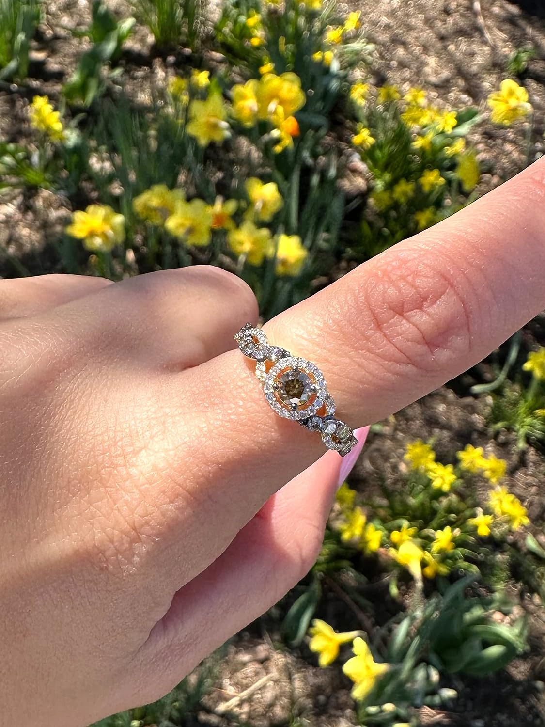 • UNMISTAKABLE ELEGANCE - This glamorous handcrafted 14K yellow gold ring by Le Vian features a large round fancy brown diamond haloed by bright white diamonds. The ring has a crossover split shank with bands of white diamonds and brown diamonds in black rhodium-plated settings that make their color pop by twisting over one another three times. This gorgeous ring is the high-profile statement piece you’ve been looking for. It’s sure to attract compliments at your next soiree or special event