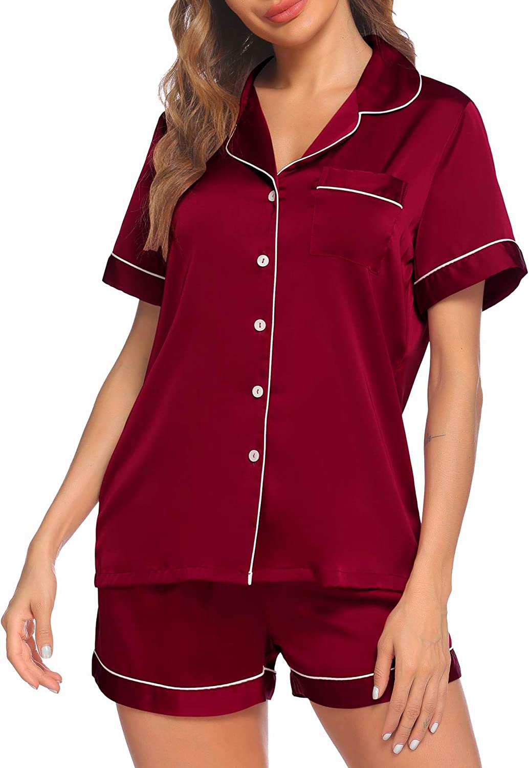 • Pajama Top:Short sleeve sleepwear with notch collar,button front pajamas shirt and one chest pocket design.Lightweight and Skin-friendly silk pajamas for women.Great for sleeping,casual wear or lounging around the house or yard all day