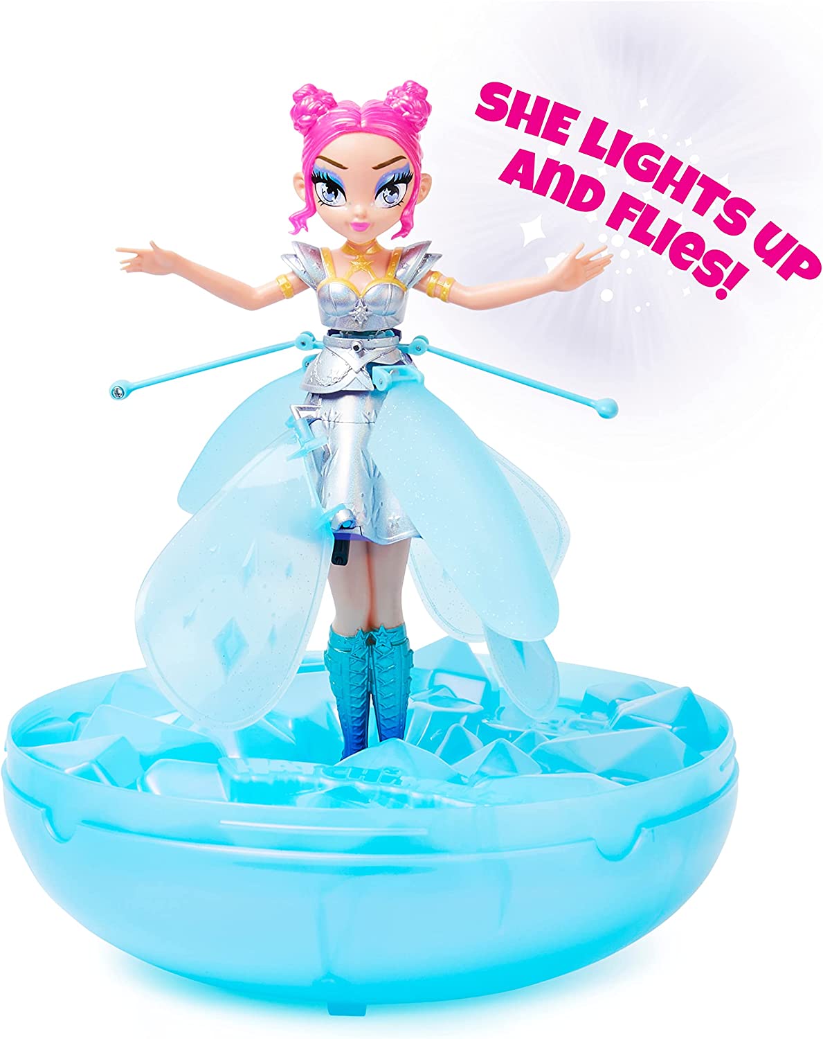 • SHE REALLY FLIES: The Crystal Flyers Starlight Idol Pixie can really fly! Launch her from the base or lift her into the air, then use your hands to guide her. She’ll sense if your hands are high or low!