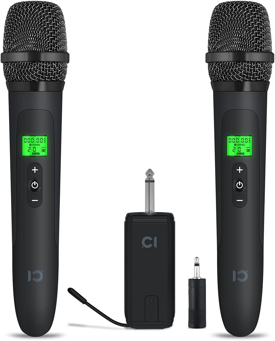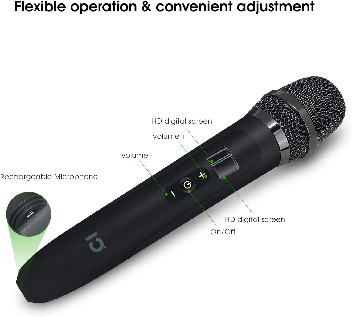 • ★Rechargeable & LED HD Display: The two UHF wireless handheld dynamic microphones are built-in polymer battery with high battery apacity, safety & long life time. Designed with LED HD Display, easy to check battery power, frequency and volume in real time on display.