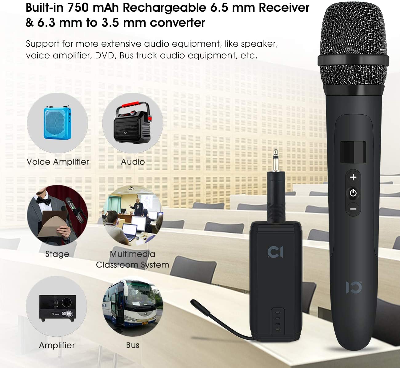 • ★Widely use: Come with a 6.5 mm Receiver & 6.3 mm to 3.5 mm converter, suitable for any audio devices with 6.5mm or 3.5mm microphone jack for wireless amplification. Support for more extensive audio equipment, like speaker, voice amplifier, DVD, Bus truck audio equipment, etc.