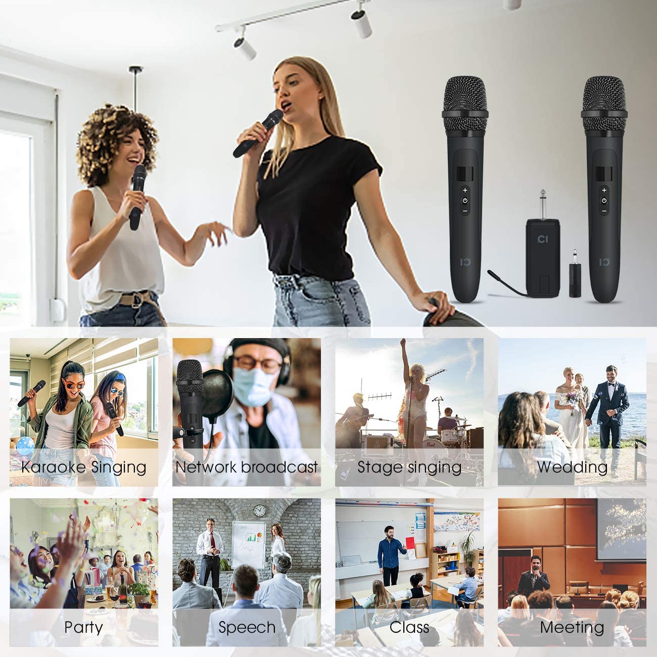 • ★High Quality Sound: These are excellent design of UHF karaoke wireless microphones. With aviation aluminum housing, stylish and durable. Enjoy high quality sound without delay and anti-howling. The ideal choice for Network broadcast, Karaoke Singing, Stage singing, Wedding, Party, Speech, Class, Meeting etc.