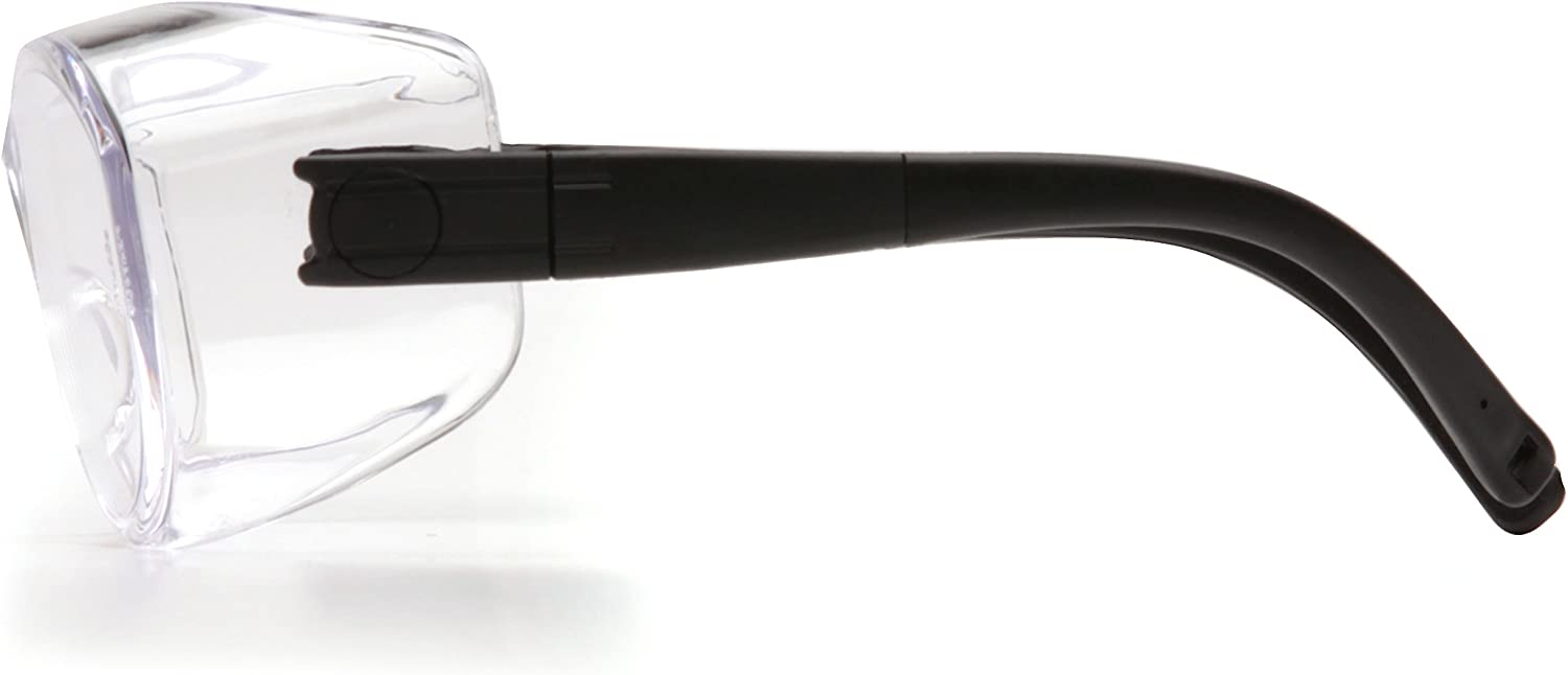 The Pyramex OTS (Over the Spectacle) safety glass is designed to fit over today's prescription eyewearThe OTS over glasses safety glasses offers single lens protection that encapsulates the eye for superb protectionThe lightweight nylon temples adjust for length and pitch for adjustingLenses are coated for superior scratch resistanceLenses provide 99% protection against harmful UV rays.