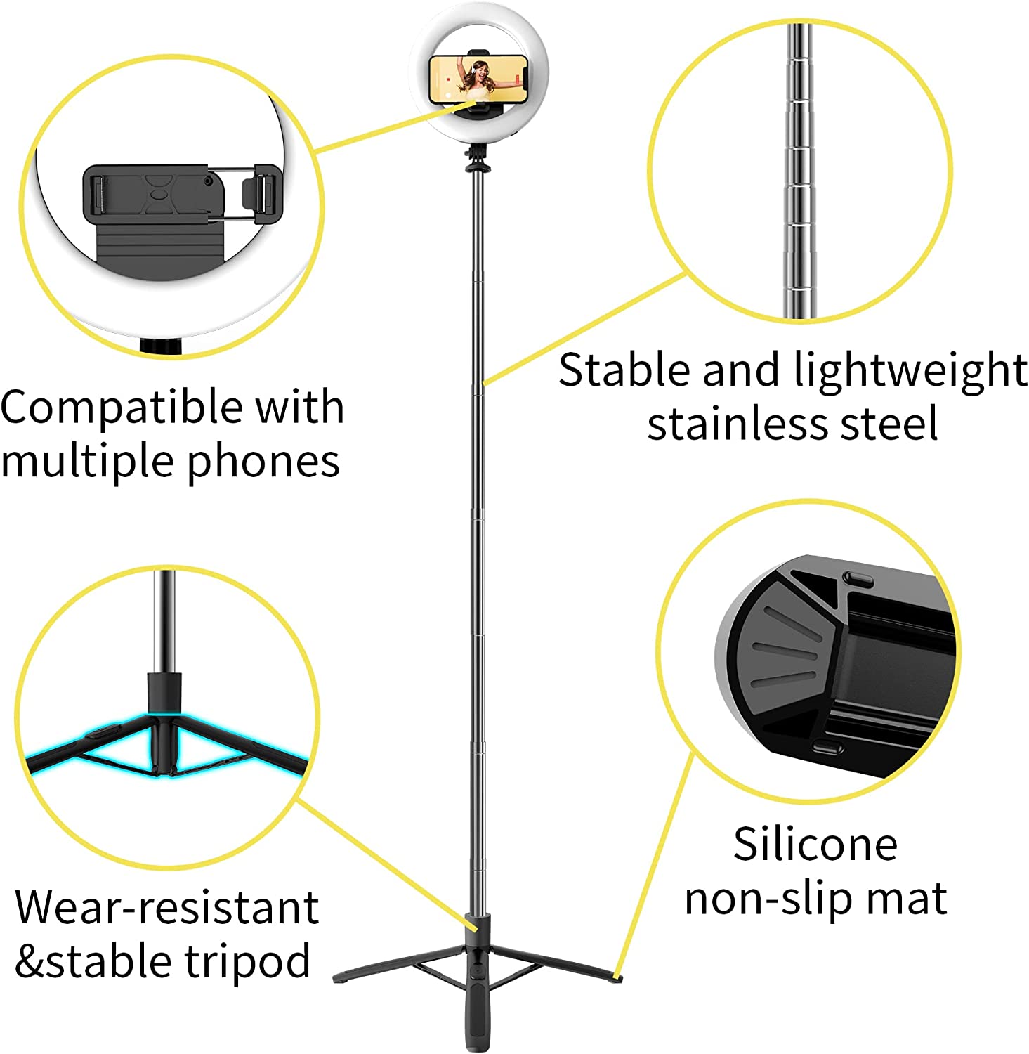 • 【Upgraded Tripod Stand】No-Twisting-To-Lock that collapses over time, SelfieShow new tripod adopts quick-flip locks and weighted tripod base for increased stability so it won't tip over. Extends from 14" to 63" and made of high-quality aluminum, it can be adjusted to any length between to match your needs and last you for years!