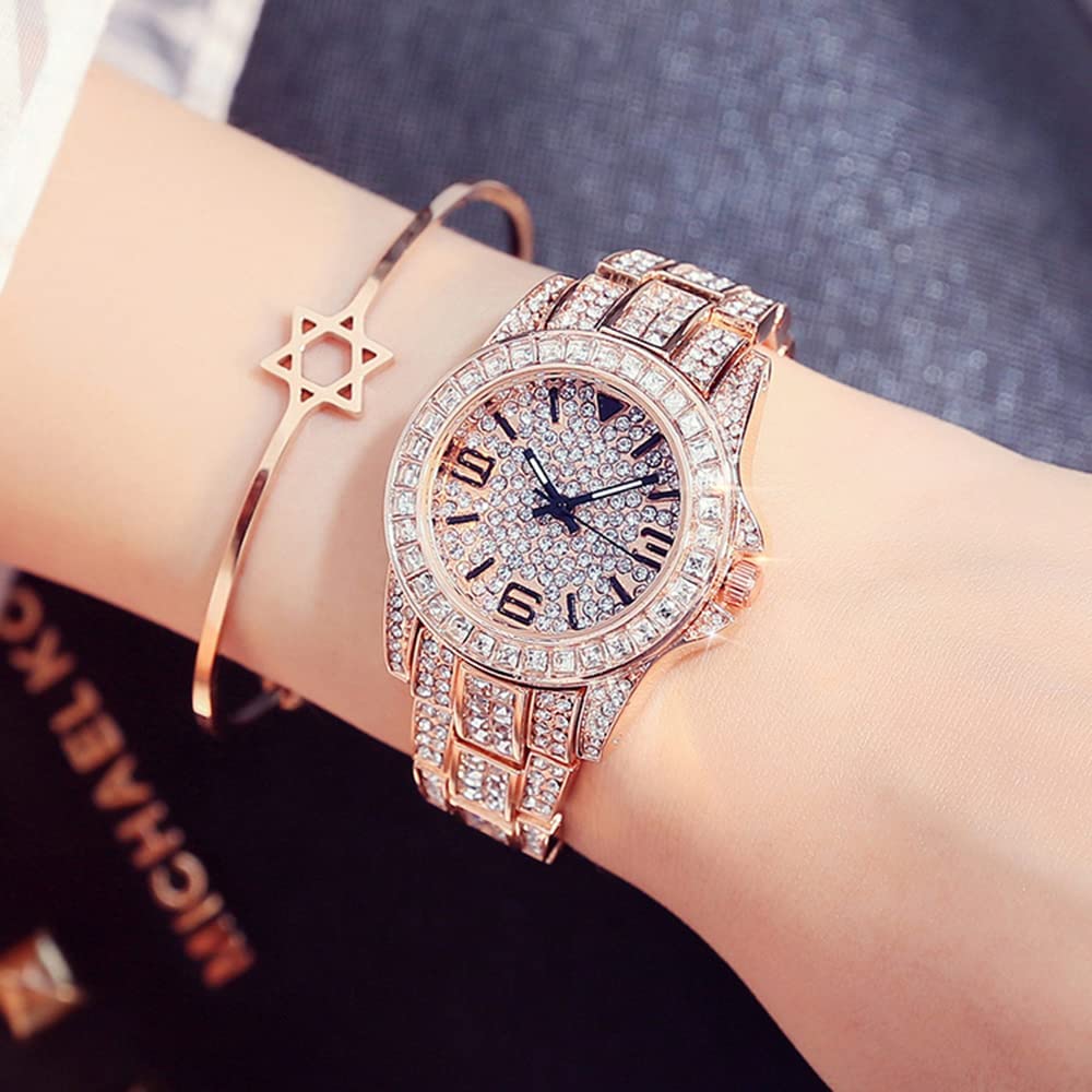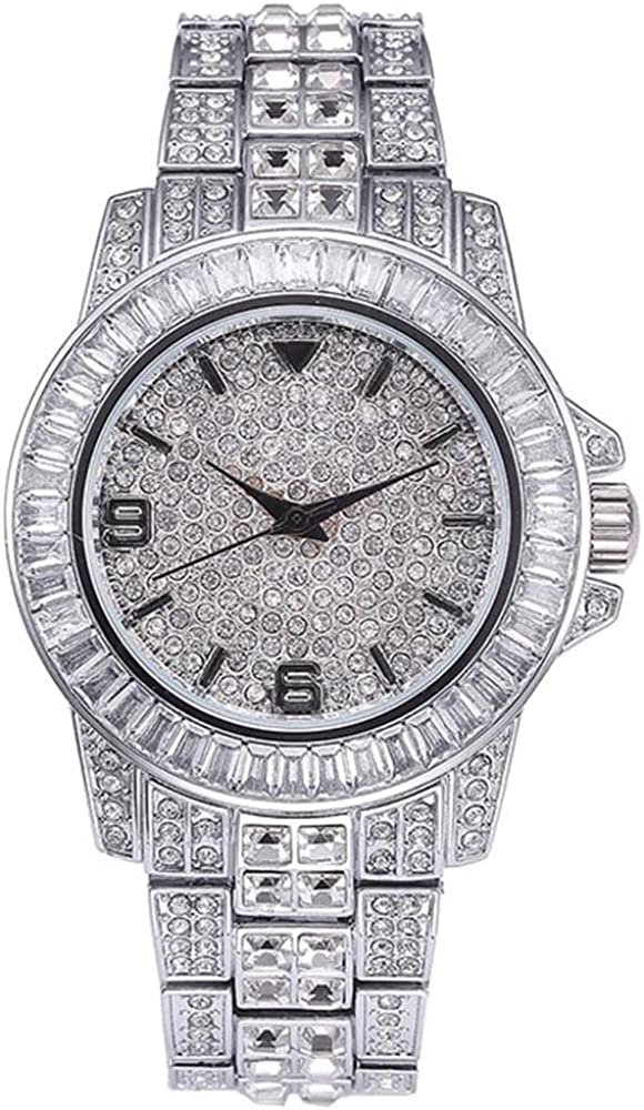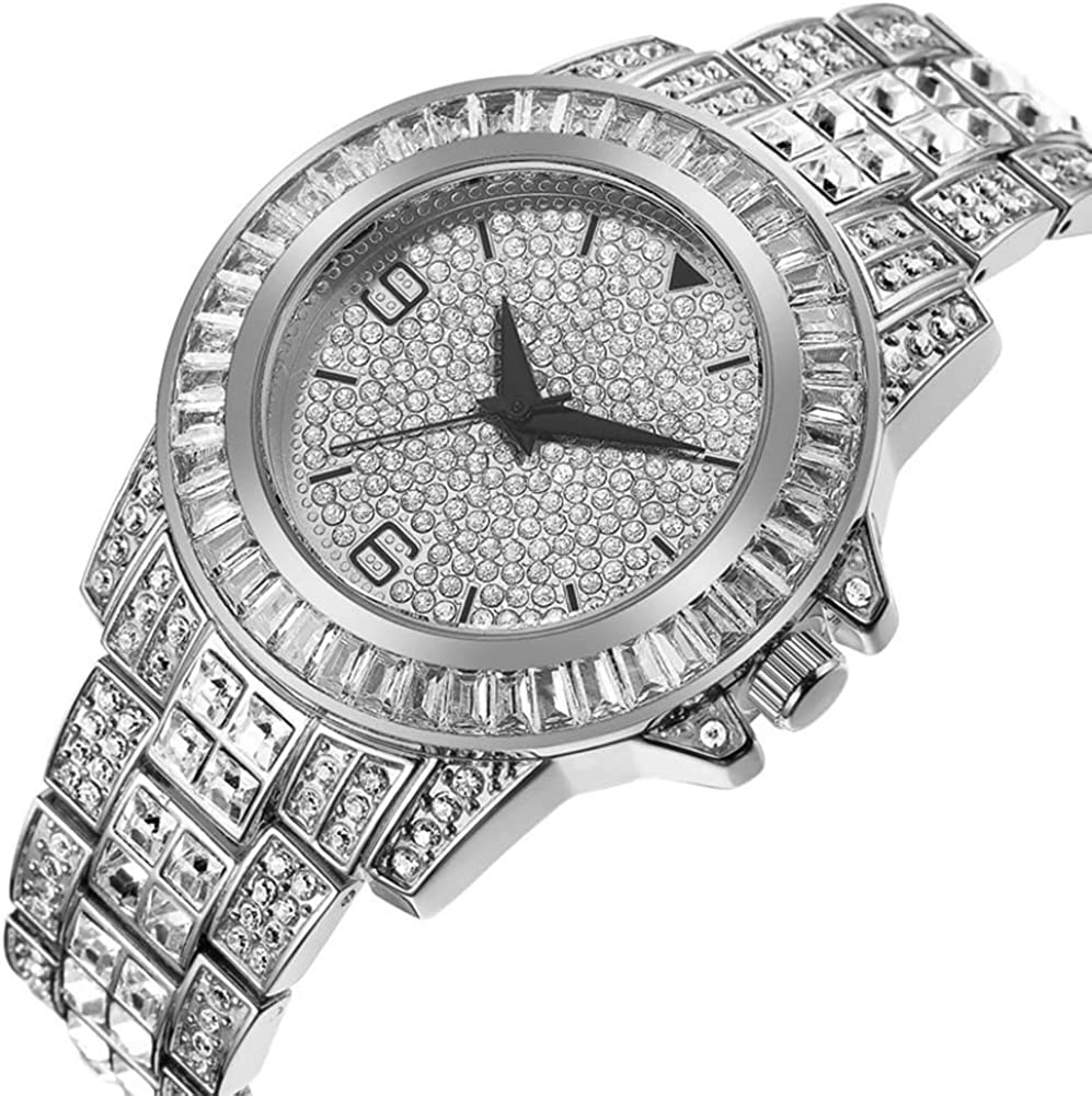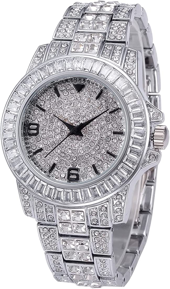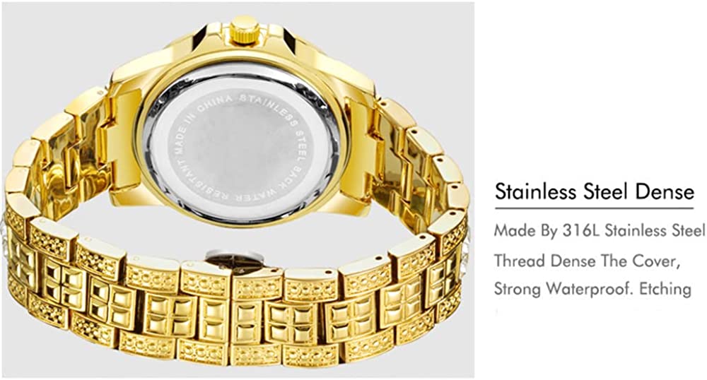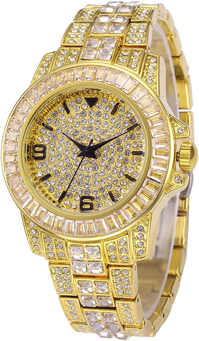 HUNRUY Mens Womens Iced-Out Watch Gold Plated Diamond Unisex Quartz Wristwatch
