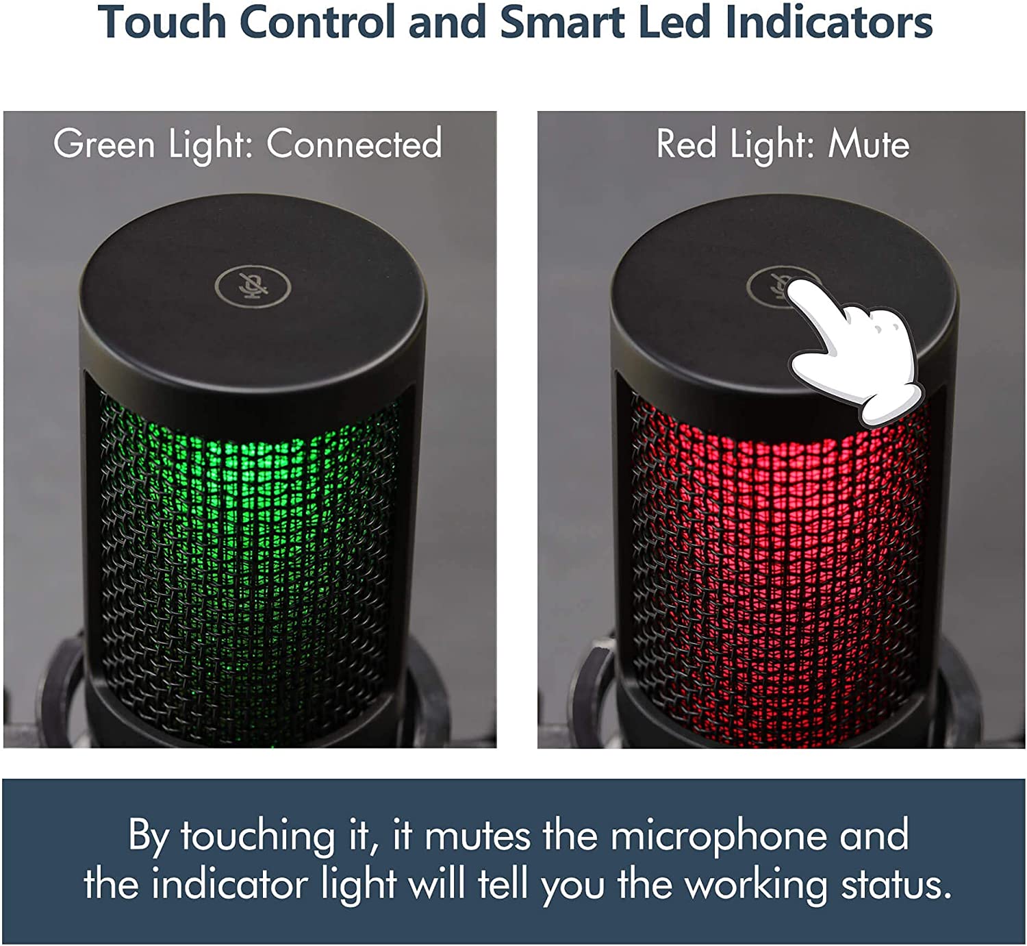 【Tap-to-Mute Sensor】 Simply press the button to change the top of the microphone then you can mute/unmute it, meeting your various needs.Built-in indicator LED lights will immediately tell you the working status(green: working, red: mute).