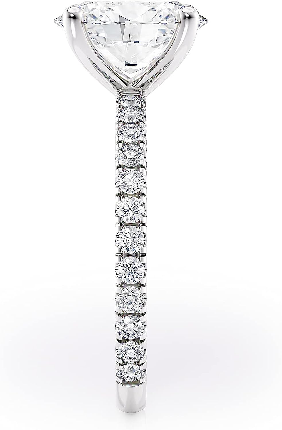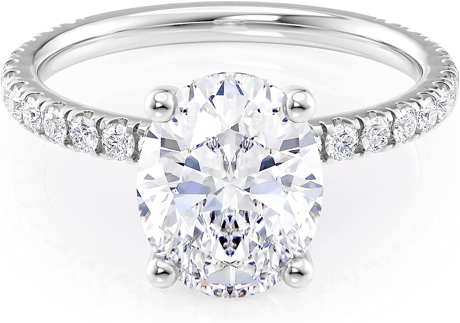 • STUNNING 2.15 CARAT ENGAGEMENT RING - This luminous 2.15-carat oval center stone engagement ring catches the eye with bold sparkle. Diamond Information - Shape : Round, Color : G-H, Clarity : SI, Total Carat Weight : 0.25, Creation Method: Natural. Moissanite Information - Shape : Oval, Color : G-H, Clarity : VS, Total gem weight : 1.90 Total Diamond Equivalent Weight (DEW), Creation Method: Synthetic. Metal: 14k rose gold, Setting: Prong, Ring sizes: 4 to 11