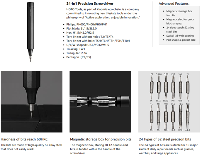 Included Components‎①Magnetic Storage box for precision bits; Portable pen-shape design. ②24 types of bits, Meet more high-precision repair needs; High-quality S2 Steel Precision Bits. ③Screwdriver lid with bearing and slip-proof handle, Suitable for single-handed usage. ④Magnetic Slot for Bits, Convenient for the quick change. ⑤Machine Dismantling; Electric Appliance Repairing; Precision Assembling; Small-Object Repairing. ⑥Weight: 150 g / Size: 12 cm x 1.7 cm x 1.7 cm. ⑦Material: Aluminum.
