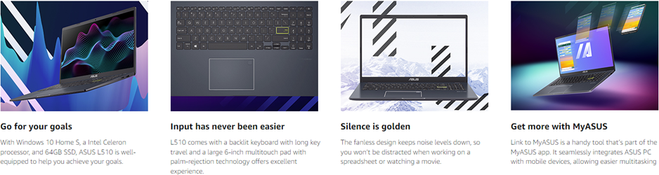 The ASUS Laptop L510MA is designed to help you be productive all day — even when you’re on the move. This compact and lightweight 14 inch laptop is powered by the latest Intel® processor and provides long lasting battery life. With eMMC storage and pre-loaded Windows 10 in S mode, it offers full compatibility with a wide range of software and peripherals. It’s the best laptop for people on the go. *The actual transfer speed of USB 3.0, 3.1, 3.2 (Gen 1 and 2), and/or Type-C will vary depending on many factors including the processing speed of the host device, file attributes and other factors related to system configuration and your operating environment. For Free Windows 11 upgrade eligible devices, visit ASUS Windows 11 website for more information.