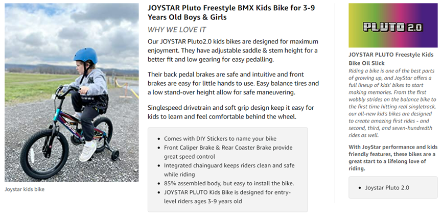 - 1. Amazing Design and Color! JOYSTAR PLUTO 2.0 Kids bike for boys girls with Bright dazzling colors, stylish and charming. DIY decals add extra fun to the ride. Soft seat offers more comfort in riding.
