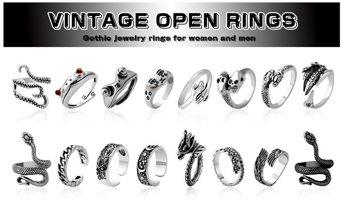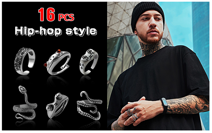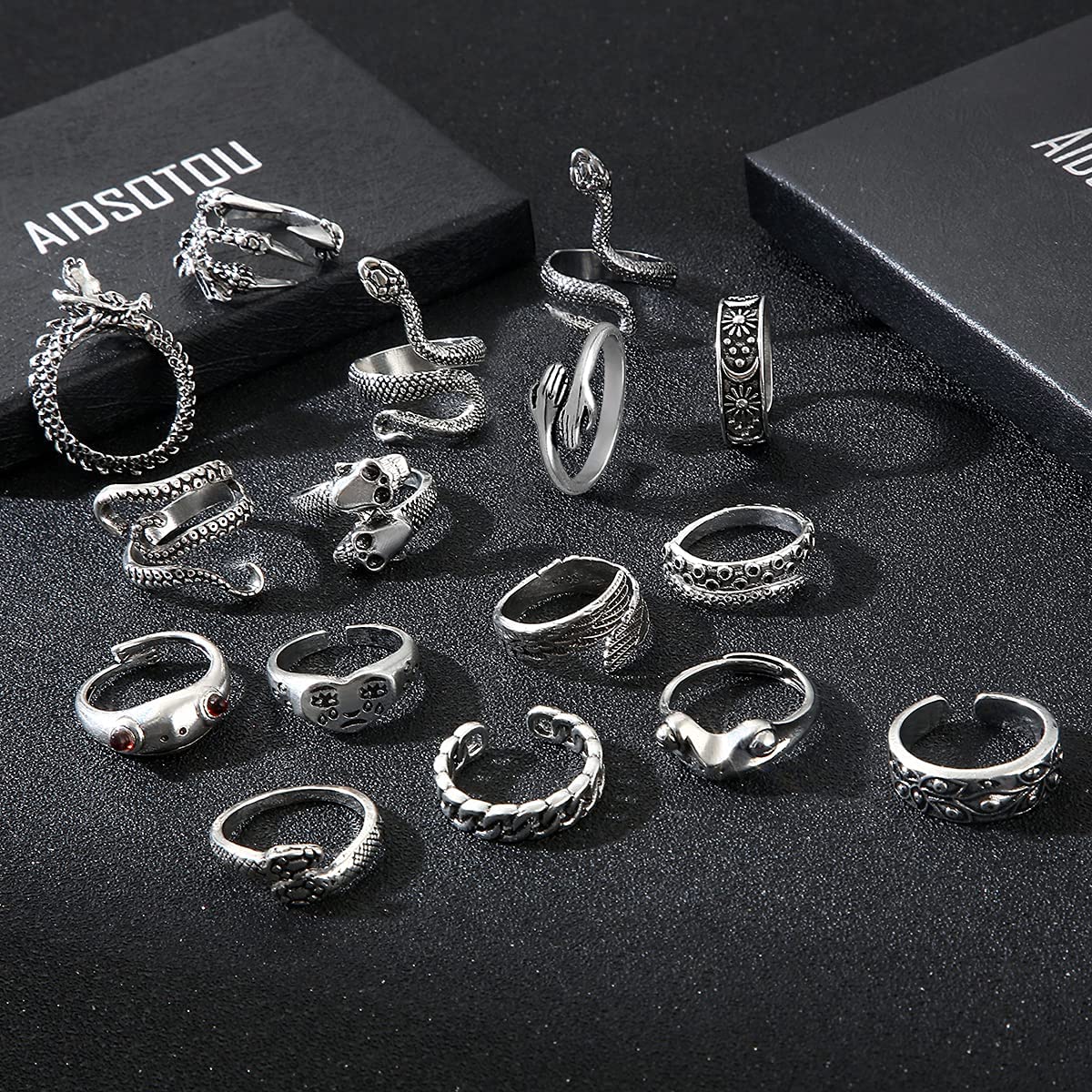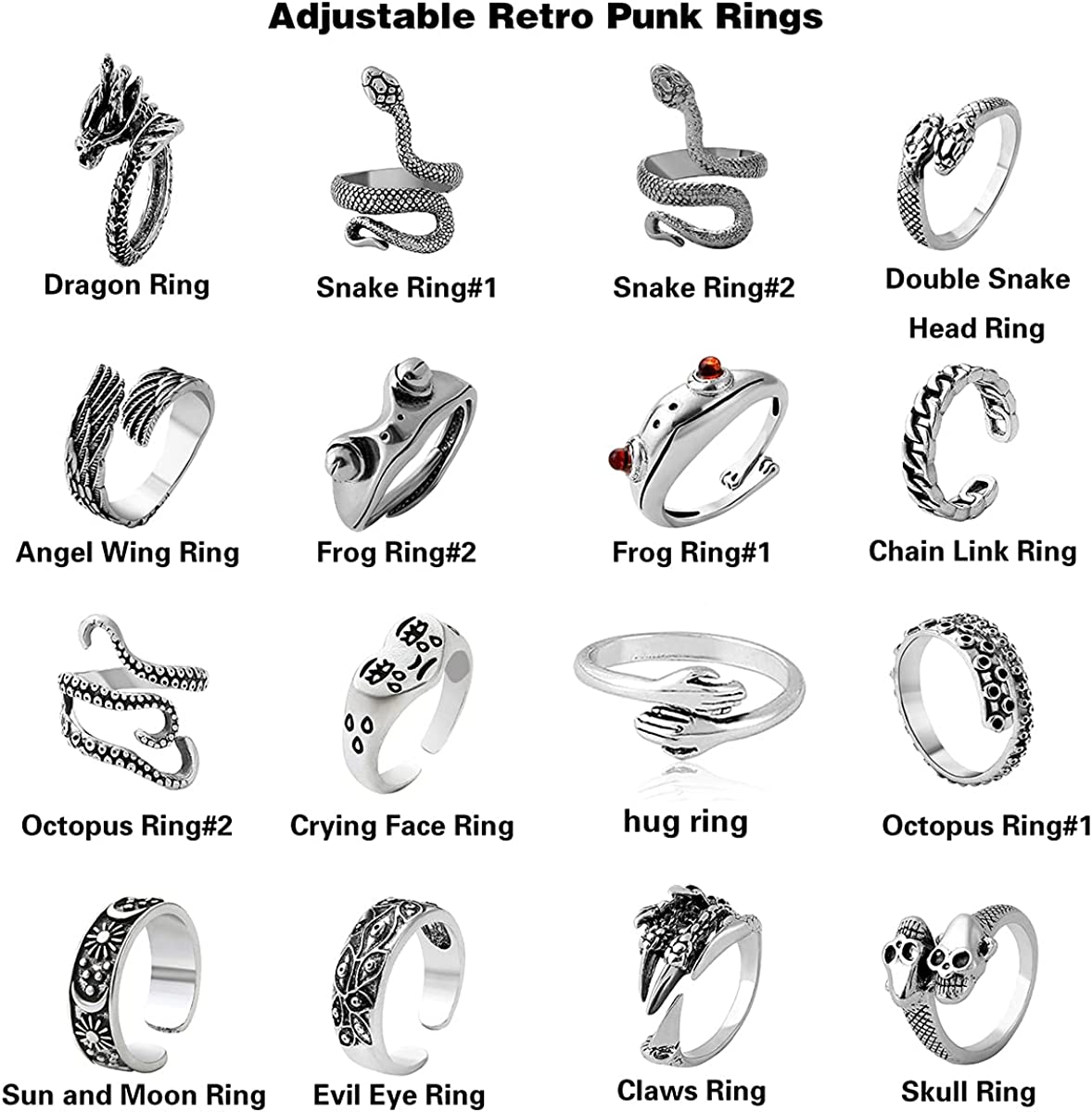 • FASHION COOL - Gothic jewelry rings pack design with 16 pcs different vintage styles, including frog ring, snake ring, skull ring, dragon ring, claws ring, octopus ring and moon ring, evil eye ring, cross ring, wing ring and more