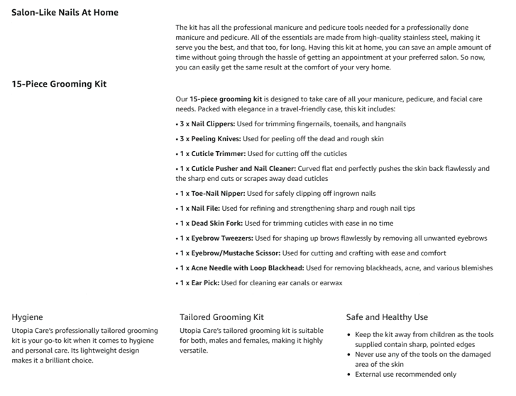 • 15 PCs MANICURE KIT- High quality, beautifully made manicure set; ideal for foot, hand and facial care. The set contains nail clippers for finger and toenails, peeling knives, cuticle trimmers, toenail nipper, nail file, v-shaped push stick, eyebrow tweezers, multi-purpose scissors, blackhead needle with loop remover and an ear pick