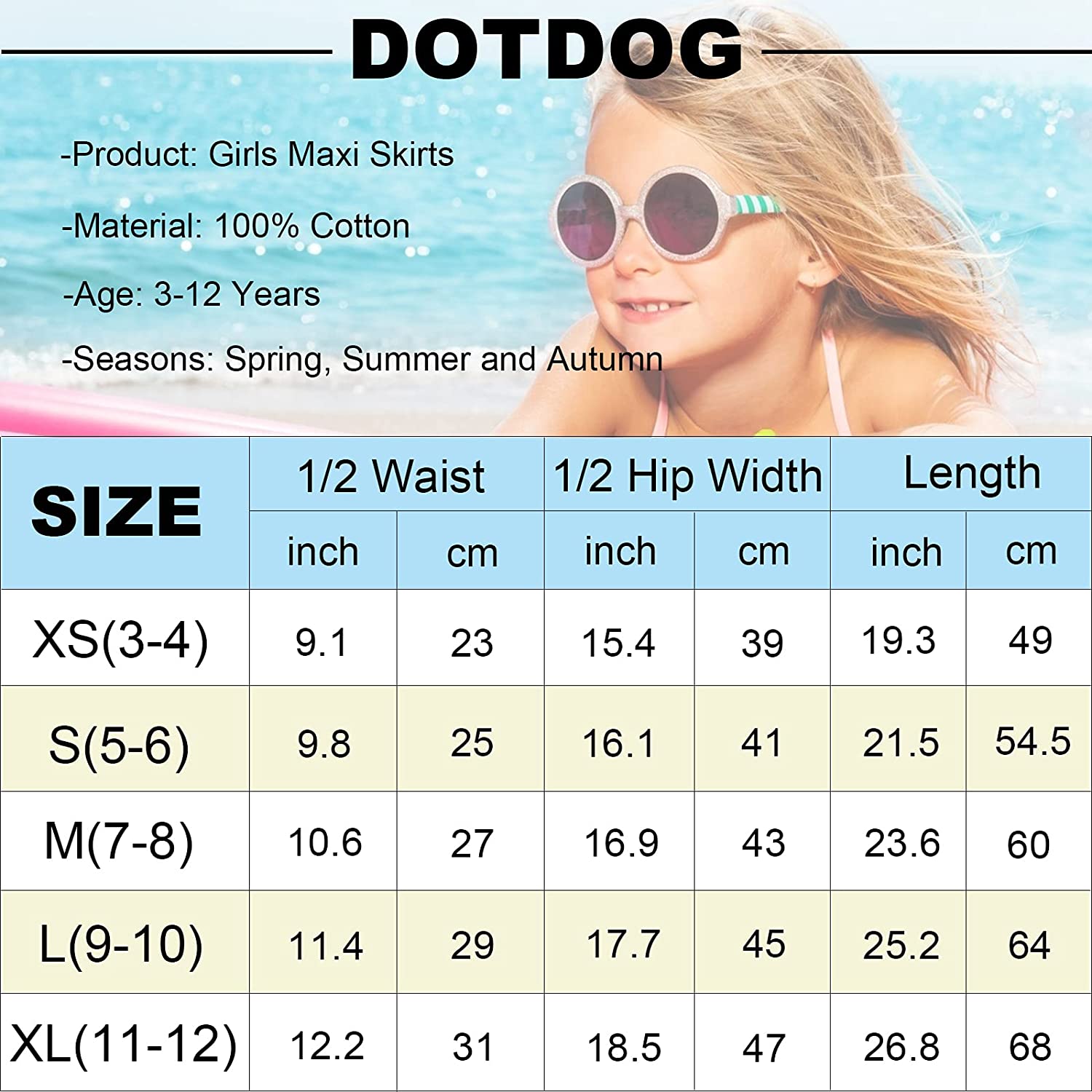 Sizes for 3-12 years old girls. Our size and pattern are based on American size standards. Please refer to DOTDOG size chart and choose the right size base on your kids’ actual height and weight. Kids of the same age may be of different height and weight. We sincerely hope that you can choose the correct yardage.