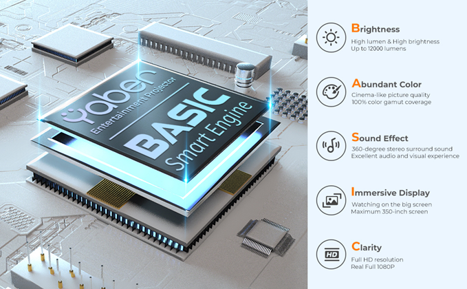 BASIC Smart Engine is a creative projection technology developed by Yaber, through which the best audio-visual experience can be obtained in five aspects——Brightness, Abundant Color, Sound effect, Immersive Display, Clarity.
