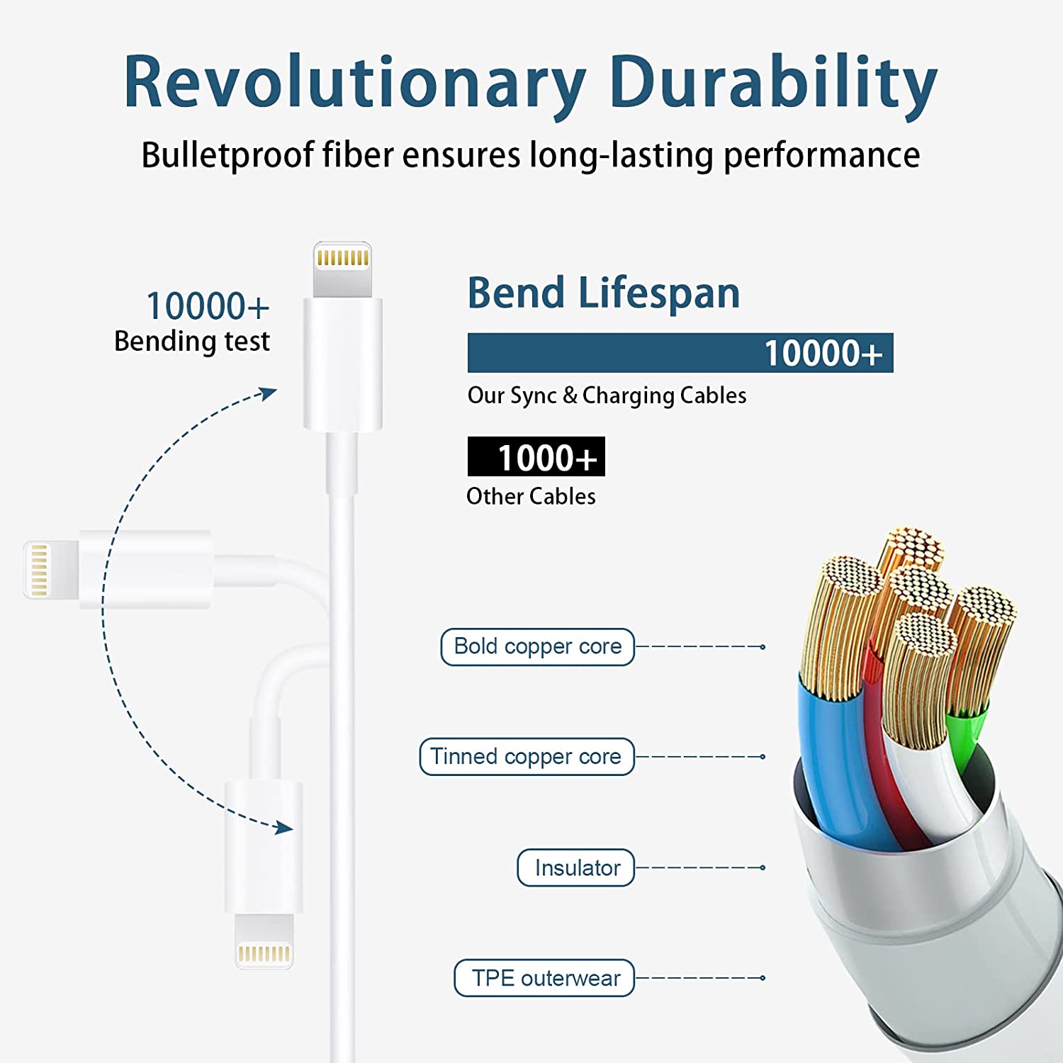 • 【Safety Efficient Fast Charging】 These apple chargers for iPhone owns bulit-in multi-protection system, avoiding from over-voltage, over-charge, over-heat, etc. The smart chip including in the MFi certified cable matches the current required by the Apple device automatically, charges your iPhone/iPad device fast, safely and steadily. Tangle-free 6 Feet length is convenient for usage while charging and sync at home/office/travel in bed, hotel rooms, and more.