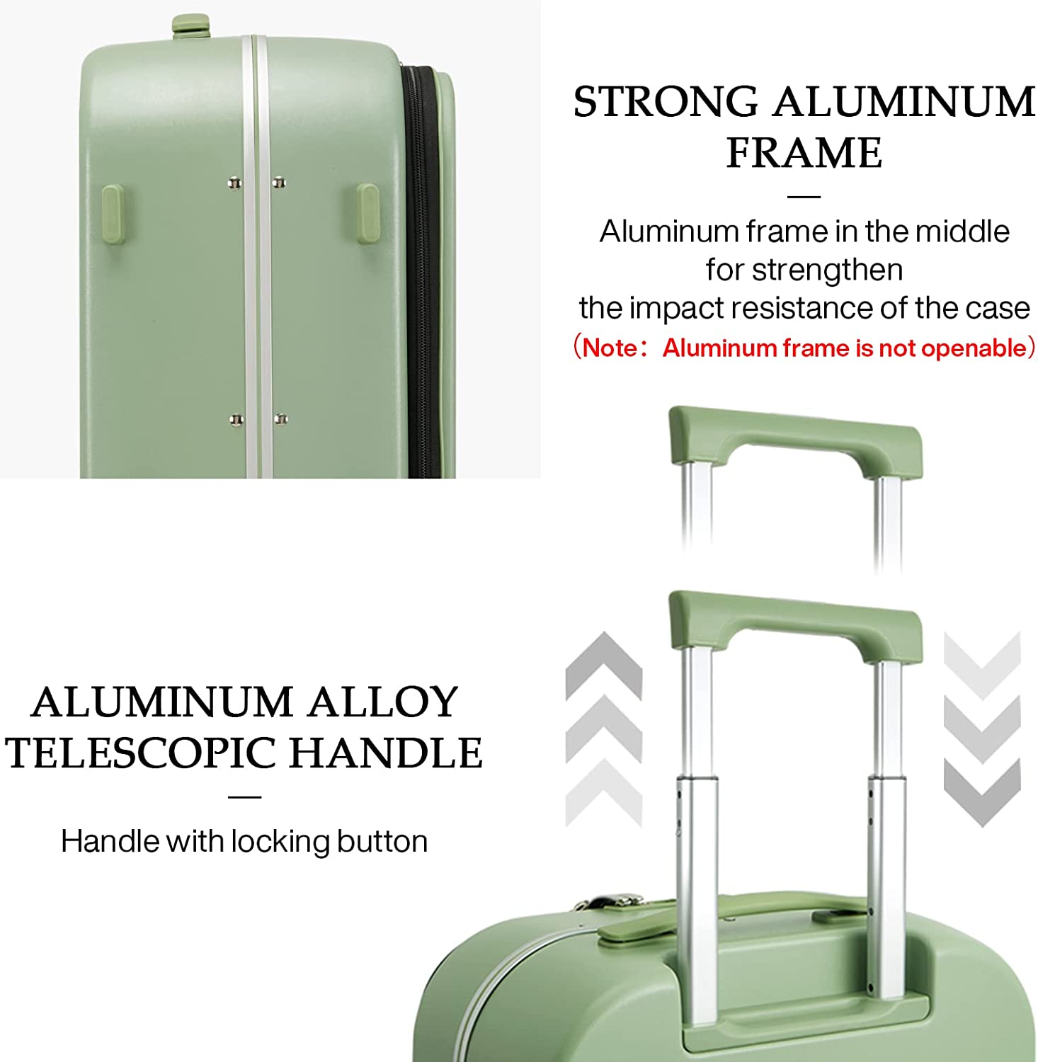 • 【DURABLE TRAVEL SUITCASE】Benefits from German Bayer PC material to prevent easily cracking or breaking, and Aluminum frame in the middle strengthen the impact resistance of the case, makes it more solid. (Aluminum frame is not openable)