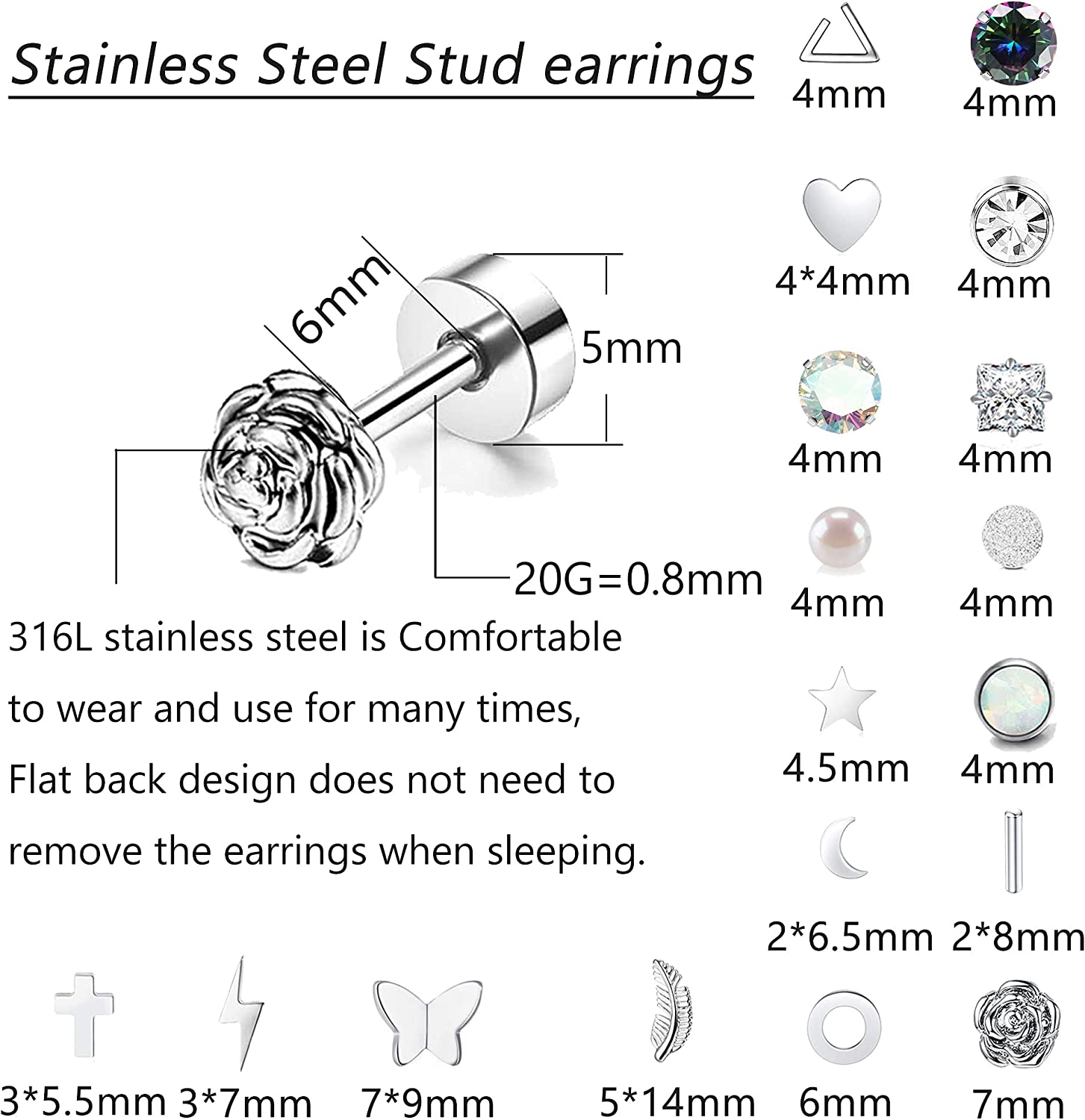 - 18 Pairs Stud Earrings Set-----You can get 18 pairs stainless steel stud earrings with one order. There are rainbow Cubic Zirconia cartilage stud earrings, opal, triangle, moon, star,butterfly, flower, leaf Geometric screwback earrings, etc. These flatback stud earrings can be used as a work party and play a match to satisfy ladies Heart of beauty.The Most fashion Tiny flat back Earrings Set, Deserve to Purchase.