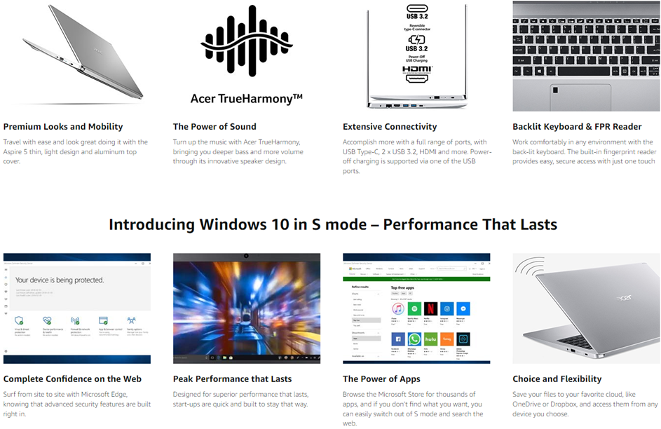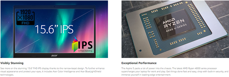 Acer Aspire 5 A515-44-R41B comes with these high level specs AMD Ryzen 5 4500U Hexa-Core Mobile Processor with Radeon Graphics (2.3GHz and with Precision Boost up to 4.0GHz), Windows 10 Home, 15.6" Full HD (1920 x 1080) Widescreen LED-backlit IPS Display, 8GB DDR4 Memory, 256GB NVMe SSD, TrueHarmony Gen 2 Technology, Two Built-in Stereo Speakers, Acer Purified.Voice Technology with Two Built-in Microphones, 802.11ac WiFi 5 (Dual-Band 2.4GHz and 5GHz), 10/100/1000 Gigabit Ethernet LAN (RJ-45 port), Bluetooth 5.0, Back-lit Keyboard, HD Webcam (1280 x 720), 1 - USB 3.2 (Type-C) Gen 1 port (up to 5 Gbps), 2 - USB 3.2 Gen 1 Port (one with Power-off Charging), 1 - USB 2.0 Port, 1 - HDMI Port with HDCP support, Lithium-Ion Battery Up to 10-hours Battery Life, 4.19 lbs 1.9 kg (system unit only) (NX.HW4AA.003).